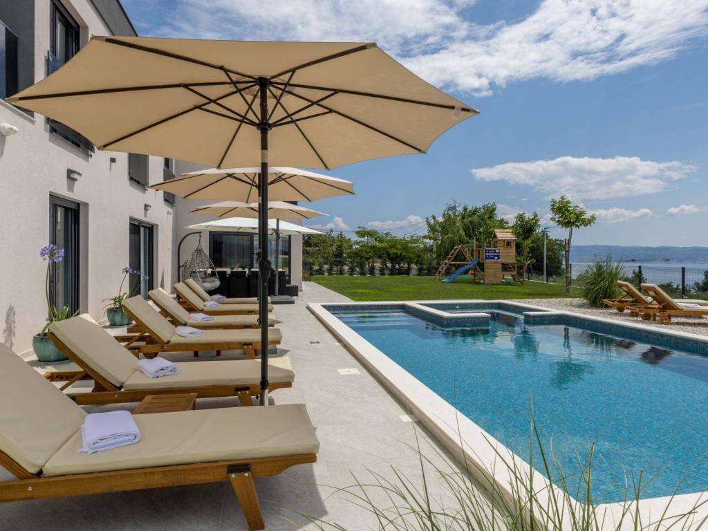Окна от пола до потолка подчеркивают вид на улицу и обеспечивают естественное освещение комнат. Современная мебель и хорошее оборудование делают эту виллу идеальным местом для спокойного отдыха. С террасы виллы открывается прекрасный панорамный вид на море. Перед виллой есть бассейн, где можно освежиться в жаркие дни, зона для загара и детская игровая площадка. Сад огорожен, поэтому вы можете наслаждаться полным уединением.