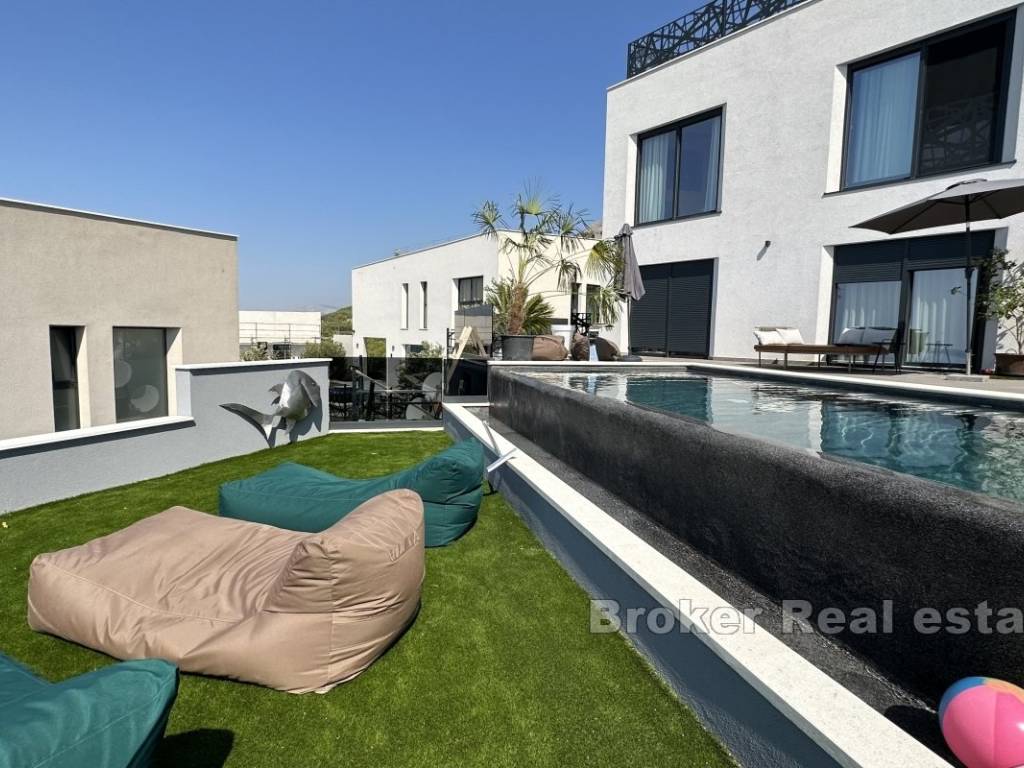 Перед виллой находится бассейн с зоной для загара и детской площадкой, что делает ее идеальным местом для отдыха и наслаждения уединением.