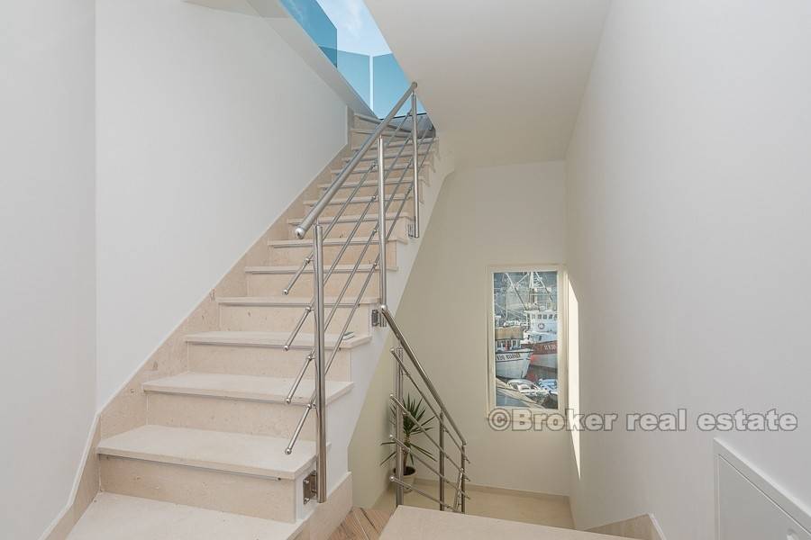 Первый этаж состоит из удобной гостиной, кухни, столовой, ванной комнаты, рабочей комнаты, лоджии и балкона. На втором этаже три спальни, каждая с собственной ванной комнатой, гардеробной и просторной лоджией. Терраса на крыше с солярием и бассейном (площадью 32 м2) предлагает прекрасный вид на море и окрестности.