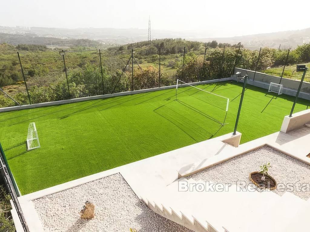 Вокруг дома ухоженный сад, бассейн на террасе с беседкой и поле для занятий спортом, с травой и освещением. В доме также есть парковка на четыре машины.