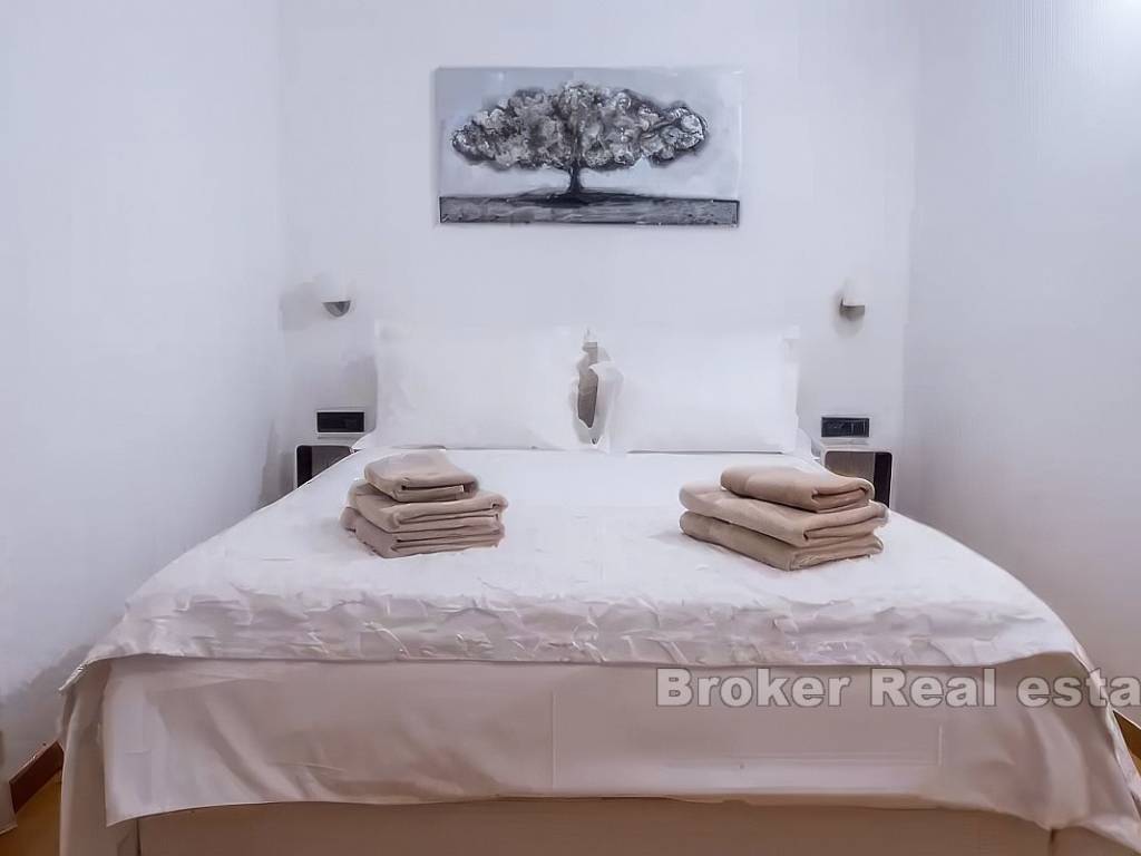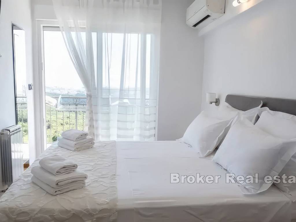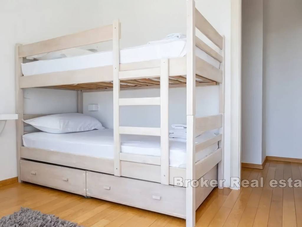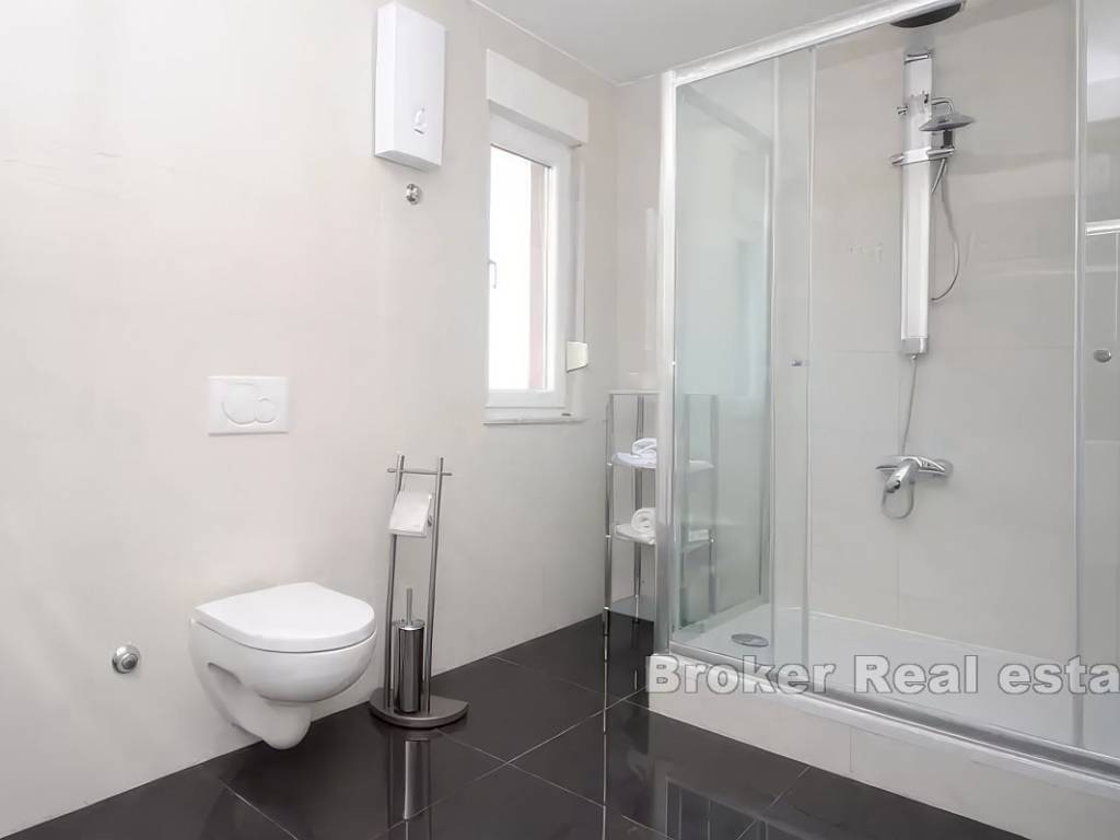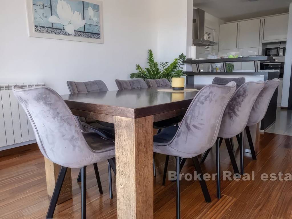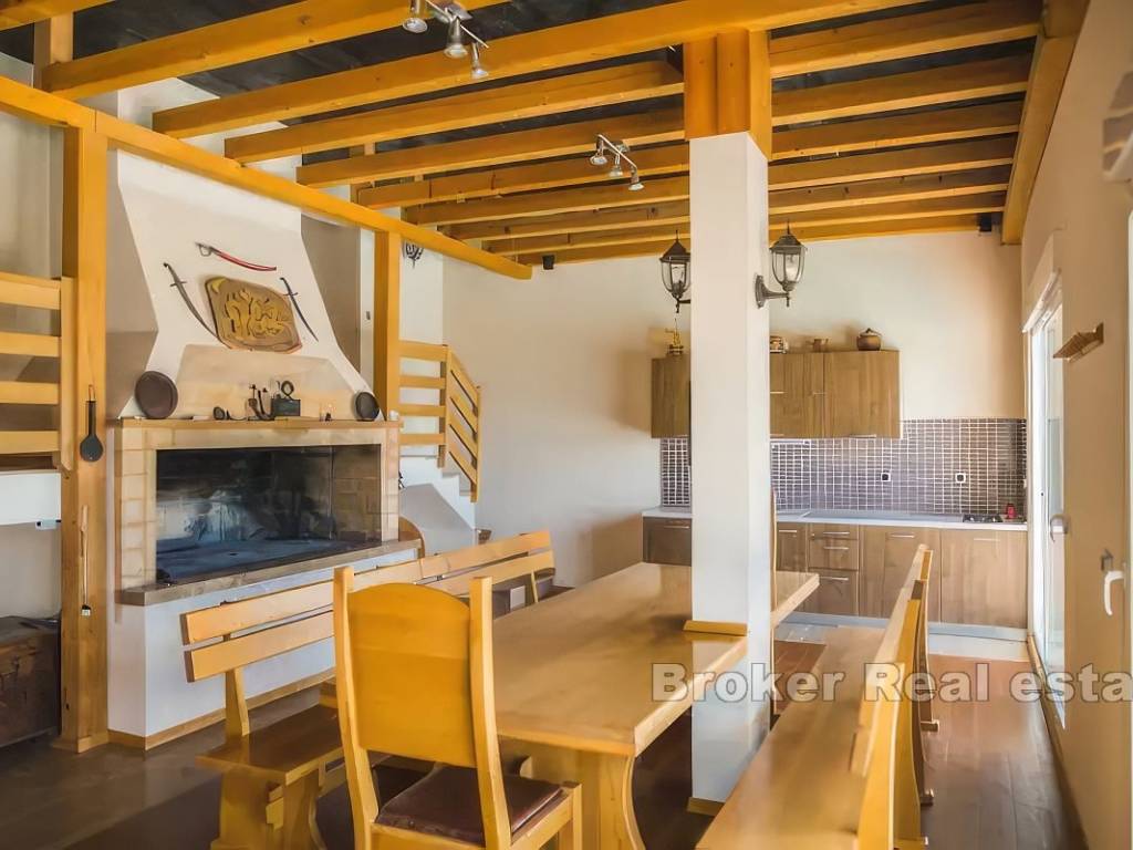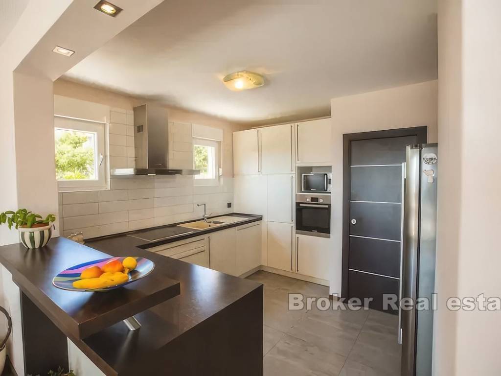 На первом этаже находятся кухня, столовая, коридор, ванная комната и гостиная с выходом на террасу 100 м2 с открытым видом на природу, Кастела, Сплит и море.