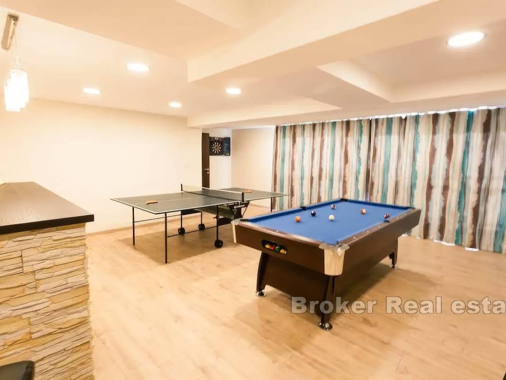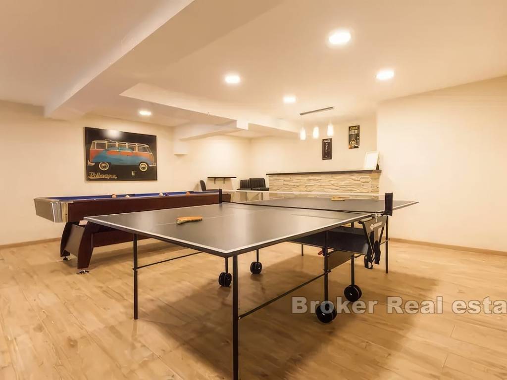 Вилла состоит из трех этажей с общей жилой площадью 335 м2, на участке 1150 м2. На первом этаже находится просторная игровая комната с баром, туалетом и таверной с камином и выходом к бассейну.