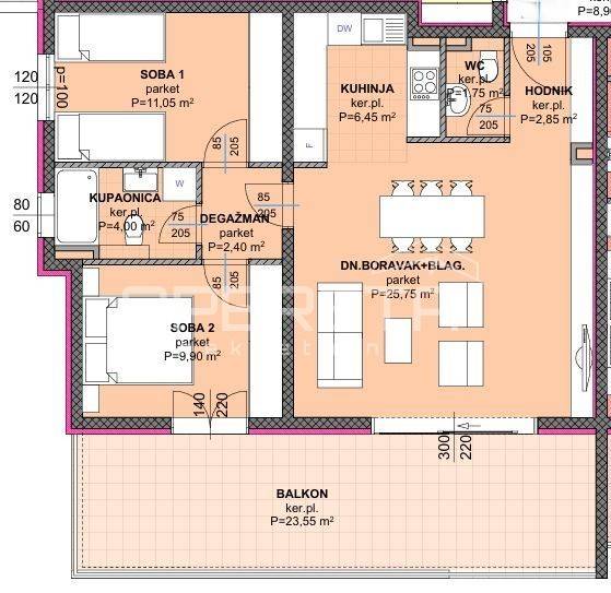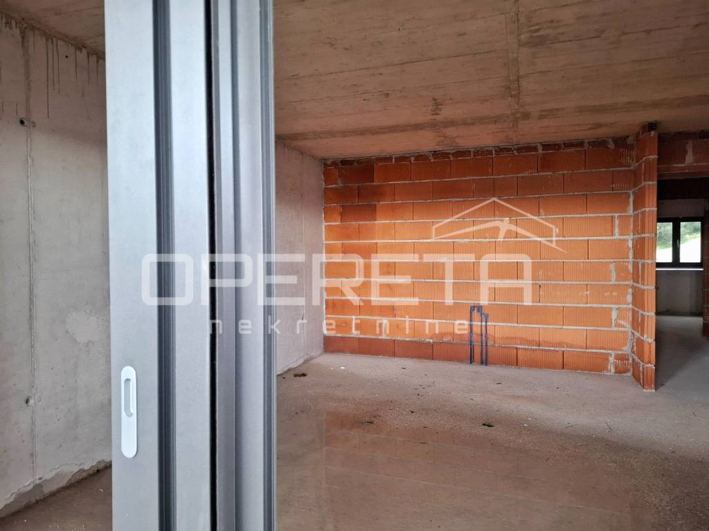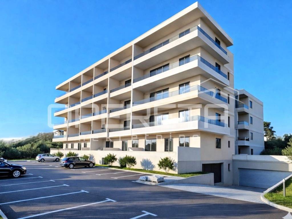 The floor plan is very functional and easily adaptable to interior design, with an entrance hallway leading to a spacious living area connected to the kitchen and dining area, which opens onto the terrace. Two bedrooms are discreetly separated by a hallway, providing extra privacy and comfort. The building is constructed with reinforced concrete, equipped with PVC-aluminum joinery and high-quality brick partition walls, while the finishing is planned with modern and durable materials, including bathrooms equipped with high-class ceramics and sanitary fixtures. The building comprises a total of 35 apartments. An outdoor parking space is mandatory with the purchase of the apartment, while garage spaces are optional.