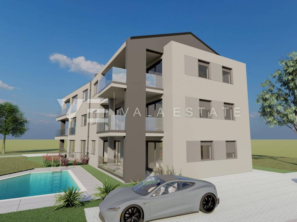 Real Estate Island of Krk, Šilo - for sale is an apartment with an excellent layout on the second floor of a new building in a prime location just 450 m from beautiful beaches and the center with all necessary amenities. The apartment has a living area of 75.69 m2 and consists of an entrance hall, two bedrooms, bathroom, kitchen, dining room and living room with access to a covered terrace with a beautiful sea view. It has one parking space in the courtyard of the building. Quality materials and equipment are used for construction, including ceramic floor coverings, quality sanitary ware, underfloor heating, air conditioning and high-quality PVC joinery. The property is currently under construction, and the planned completion is expected by the end of 2027. The apartment is subject to VAT and the buyer does not pay real estate tax. Vala Estate Malinska Agency will enable you to transfer ownership safely and transparently and provide all necessary documentation.