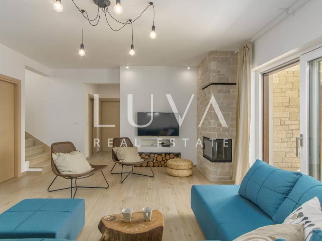 Thoughtfully designed for extended stays, the house features three comfortable bedrooms, a spacious living room with a pull-out sofa (ideal for additional guests), and a charming kitchen with a dining area. A fireplace adds warmth and coziness during cooler evenings. Outside, a large terrace with a dining area surrounds the house, while the private pool with sun loungers is the ideal spot for relaxation in the sun.