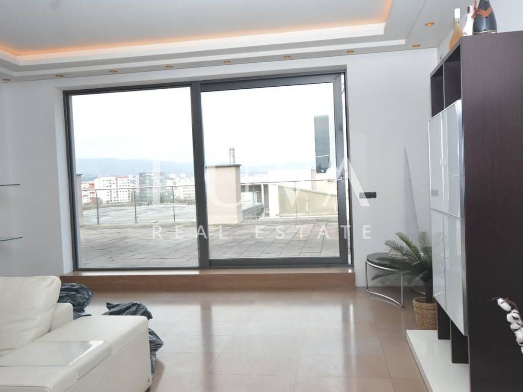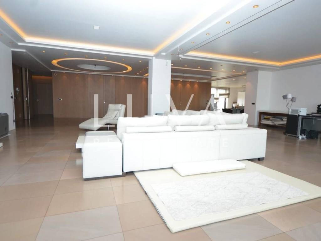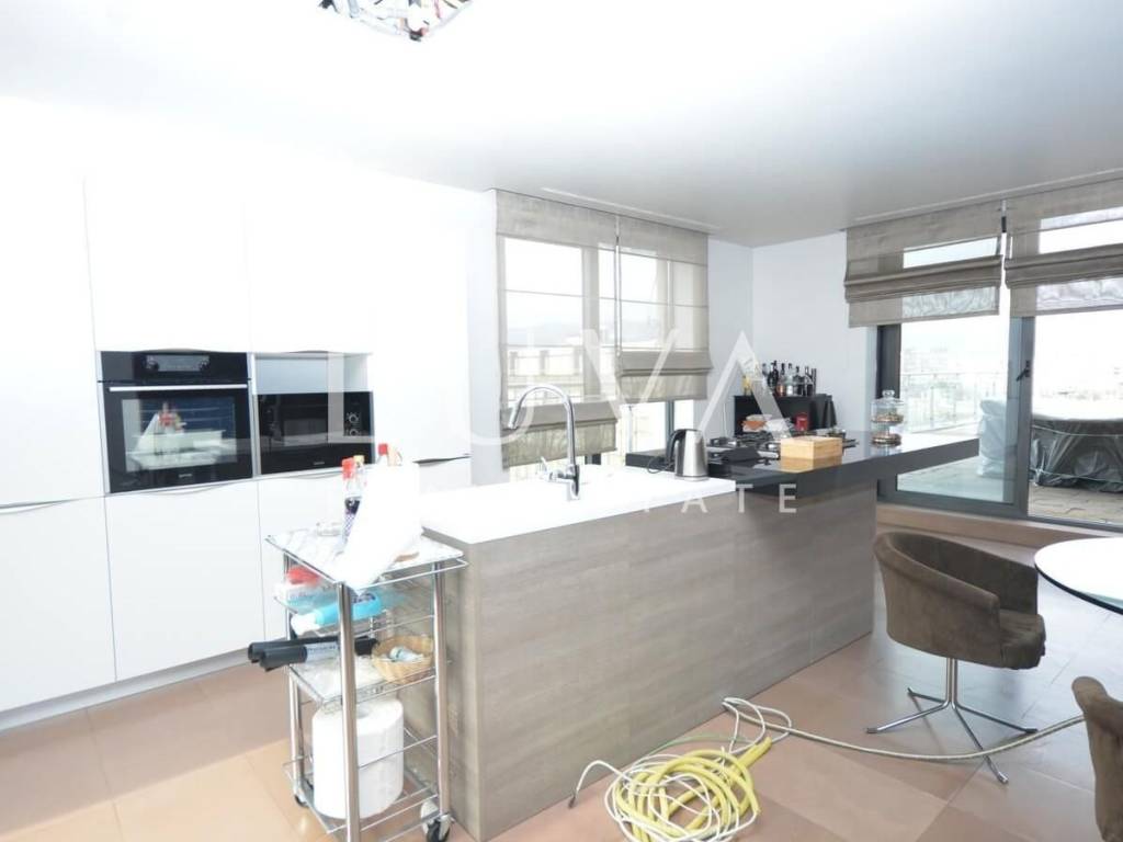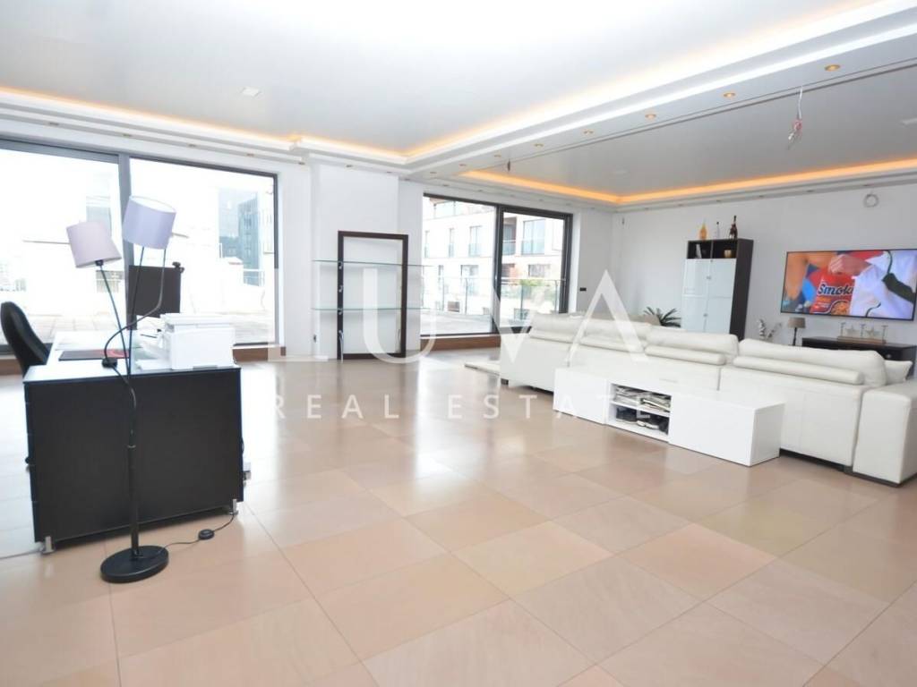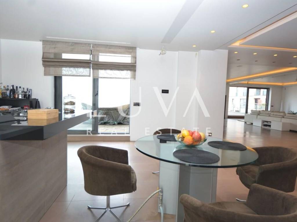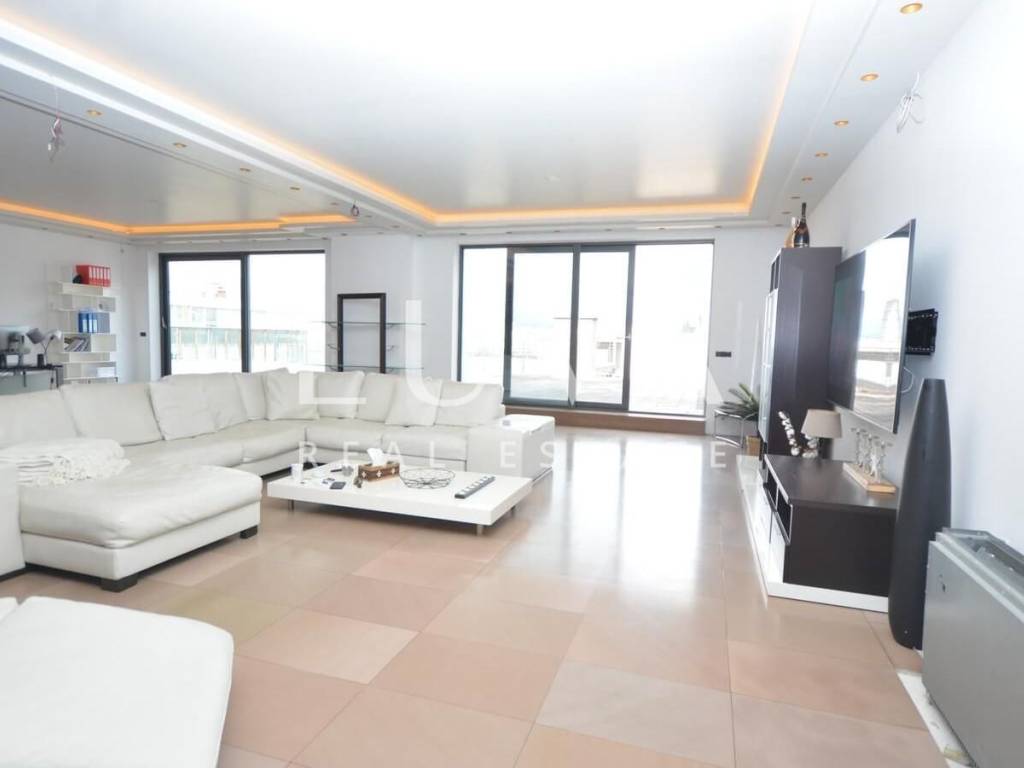 A luxurious, modern, spacious penthouse in a new reinforced concrete building is for sale. Located on the 5th floor, the building has 2 elevators connected to the garage. The apartment has a net area of 276.49 m², a terrace area of 213.20 m², and 55.02 m² for 3 garages, totaling 544.71 m² gross, or 367.96 m² net according to calculation coefficients.