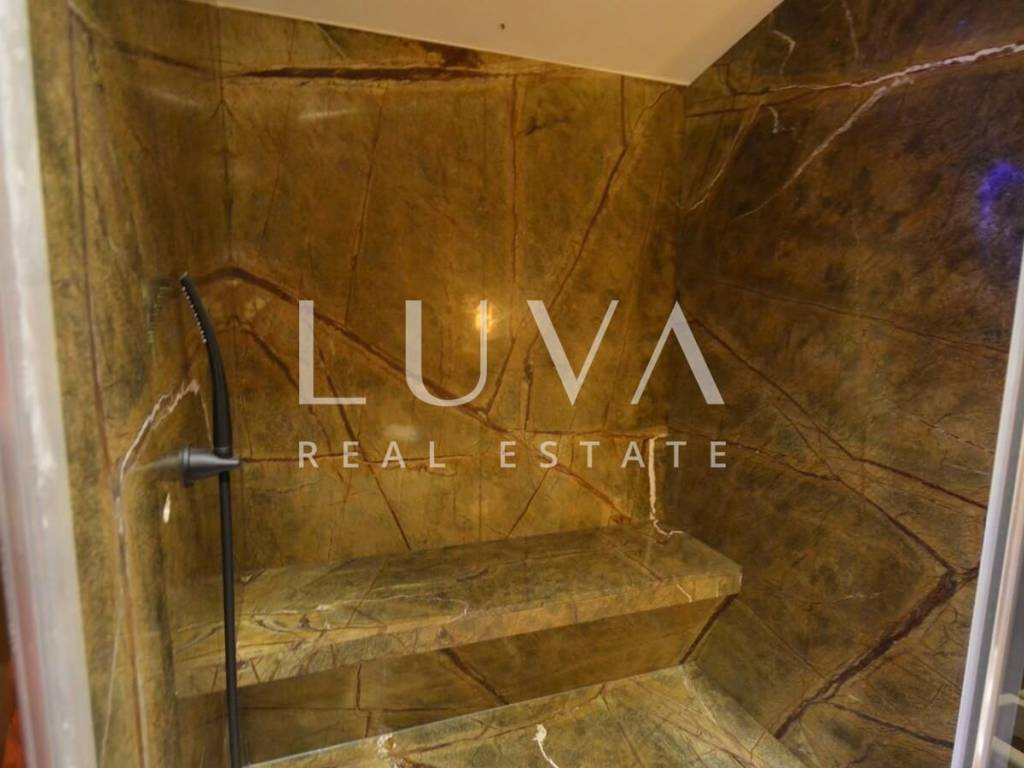 The penthouse features a spacious living room, kitchen with dining area, 2 large bedrooms, 2 bathrooms, and a large terrace. The master bedroom includes a dressing room and a large bathroom with a sauna and Jacuzzi.