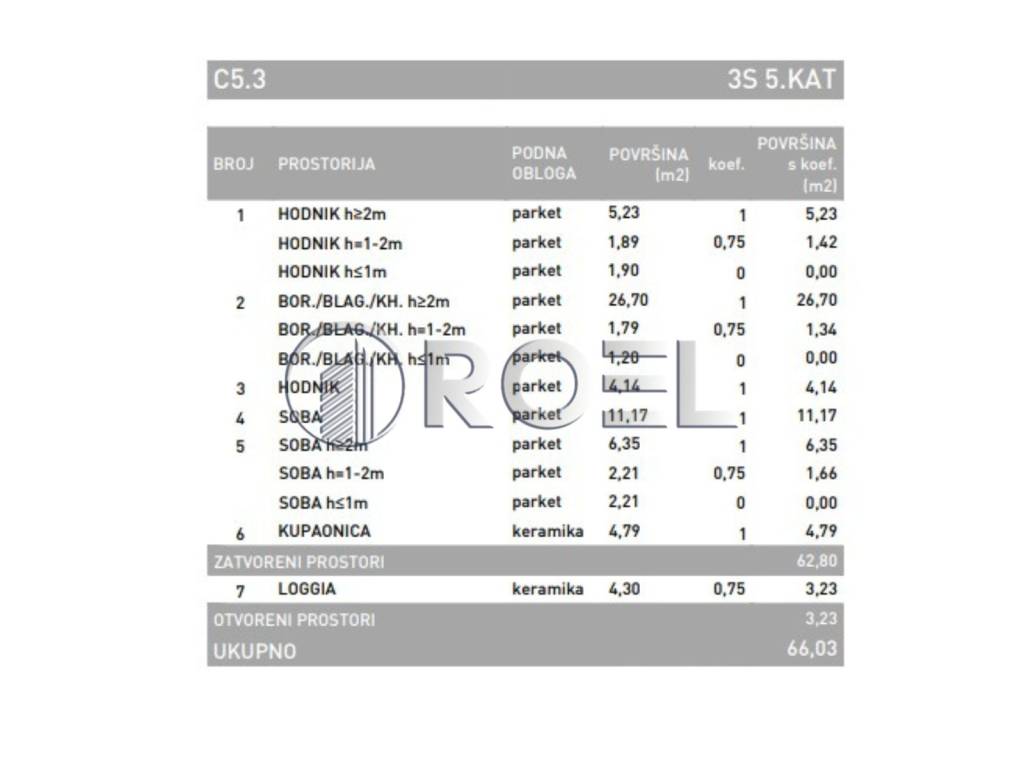 Three-room apartment with a total area of 66.03 m, located in the Dubrava district of Zagreb. It is located on the fifth floor of a building with a total of 6 floors. It consists of an entrance hall, living room with kitchen and dining room, two bedrooms, bathroom with toilet and a loggia. It is oriented to the south and north.