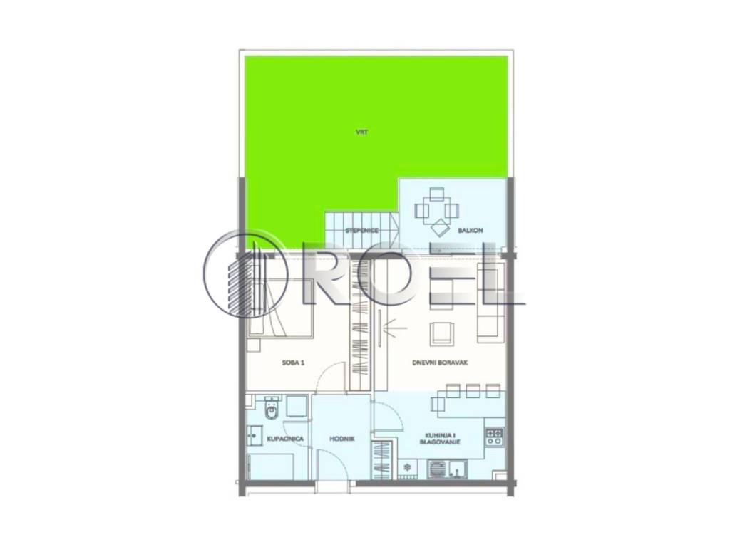The apartment is located on the ground floor of the building. It has an area of 59.42 m2 and consists of a hallway, kitchen with dining area, bathroom, balcony, bedroom and a garden of 36 m2.