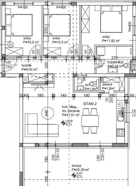 Hallway – 9.00 m² Living room, kitchen and dining area – 31.51 m² Bedroom 1 – 10.00 m² Bedroom 2 – 10.00 m² Bedroom 3 – 11.82 m² Bathroom – 5.34 m² WC – 1.80 m² Storage room – 1.80 m² Terrace – 16.83 m² Terrace – 4.59 m²