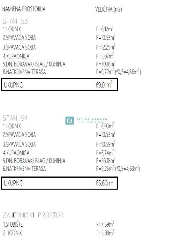 Apartment S4 with a total usable area of ​​70.60 m2 (living area of ​​65.60 m2 + two parking spaces of 25 m2) is located on the 1st floor. The functionally arranged apartment consists of a hallway, bathroom, two bedrooms, kitchen with dining room, living room with access to a covered terrace of 9.25 m2. The apartment has two parking spaces. The price is €218,860.
