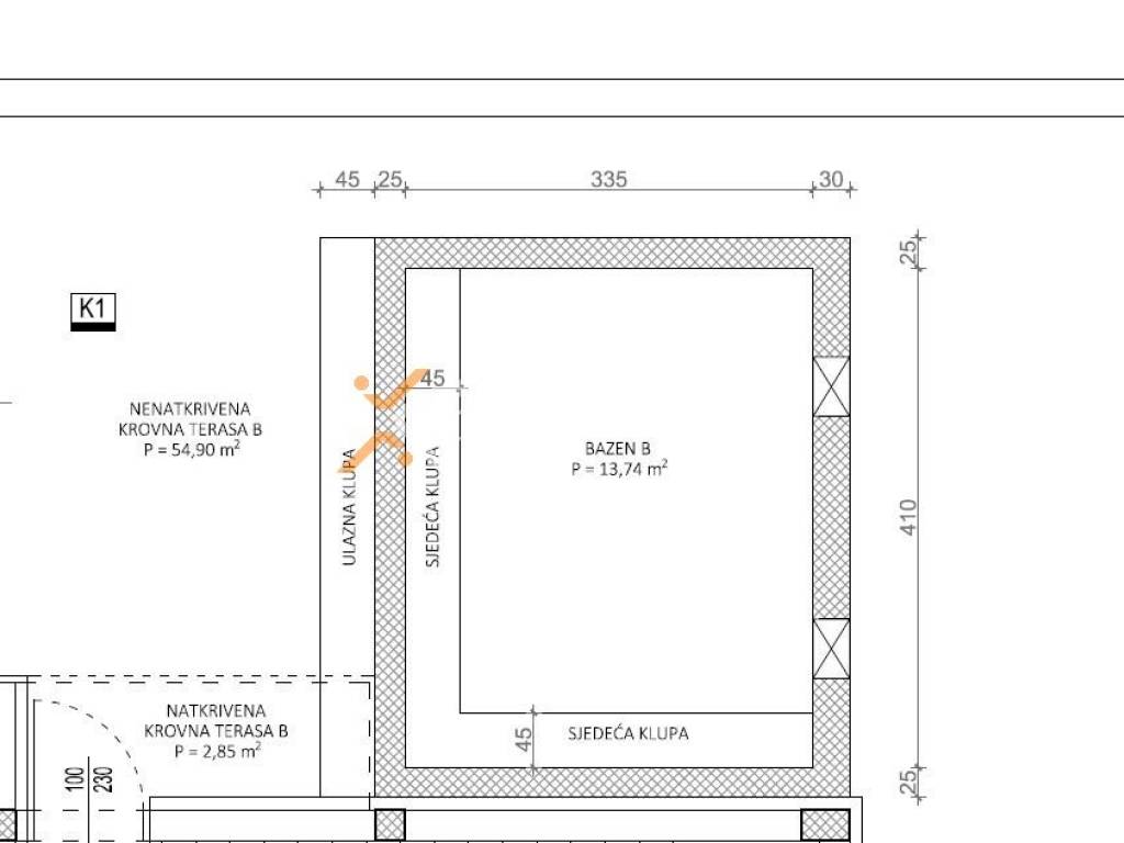 The rooftop terrace features a swimming pool of 13,74 m2, while 3,43 m2 is calculated into the net usable area according to the coefficient. The net usable area of the described rooms is 88,94 m2. The apartment includes two parking spaces, therefore the total net area with accessories is 94,14 m2.