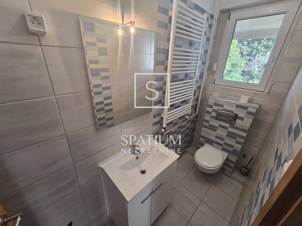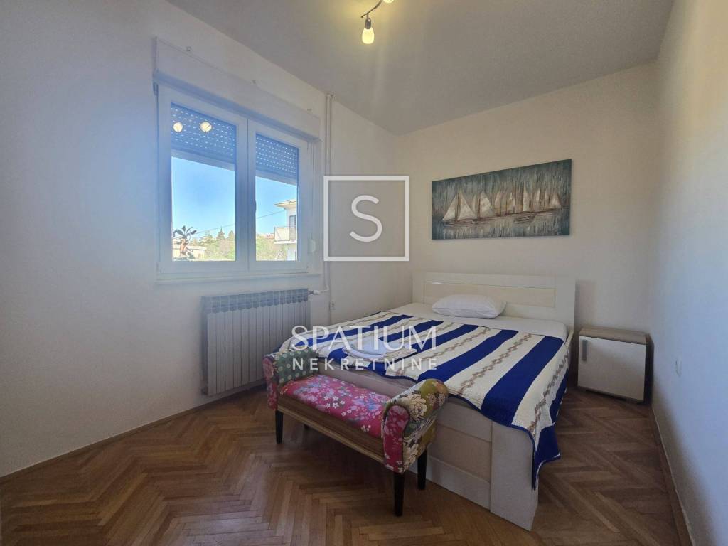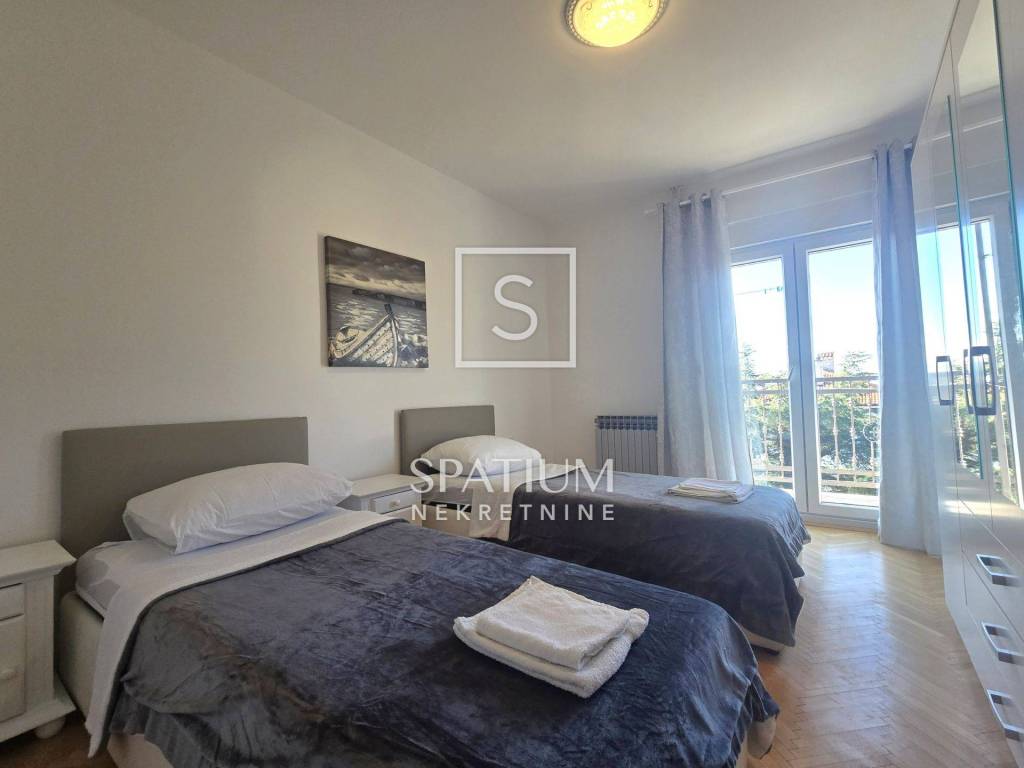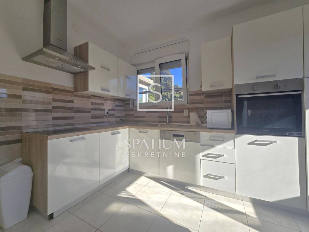 KOSTRENA, for long-term rent is a four-room classic apartment of 114.81 m2 with a balcony with a beautiful view of the sea and the surrounding area. It consists of an entrance porch, hallway, three bedrooms, living room, kitchen with dining area and storage room, bathroom and toilet. A balcony stretches across the entire south side, which can be accessed from the living room and the bedroom.