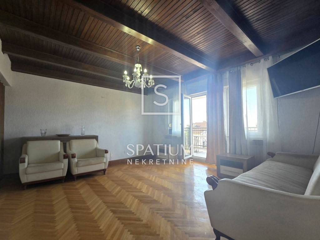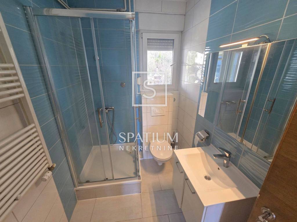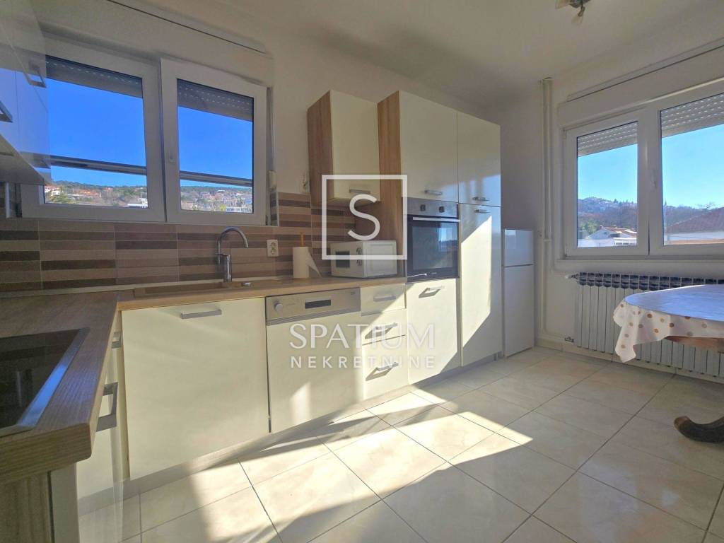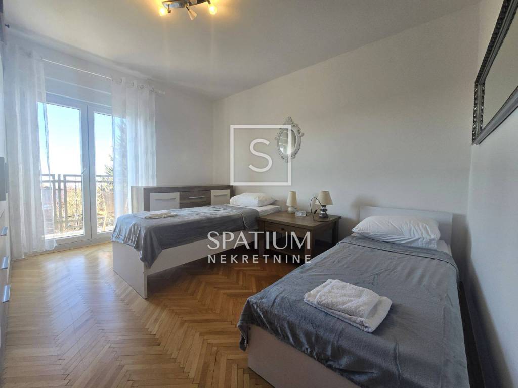 KOSTRENA, for long-term rent is a four-room classic apartment of 114.81 m2 with a balcony with a beautiful view of the sea and the surrounding area. It consists of an entrance porch, hallway, three bedrooms, living room, kitchen with dining area and storage room, bathroom and toilet. A balcony stretches across the entire south side, which can be accessed from the living room and the bedroom.