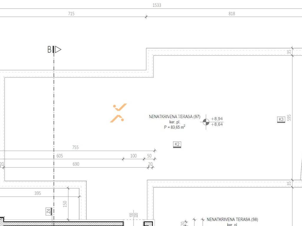 The apartment consists of an entrance hall, 2 bedrooms, laundry/WC, bathroom, kitchen with dining area and living room, and a loggia (77,13 m2 net), while from the stairs it leads to a rooftop terrace of 83,65 m2. The net usable area of enclosed rooms is 98,04 m2. Additionally, the apartment includes 2 parking spaces and a storage room in the basement.