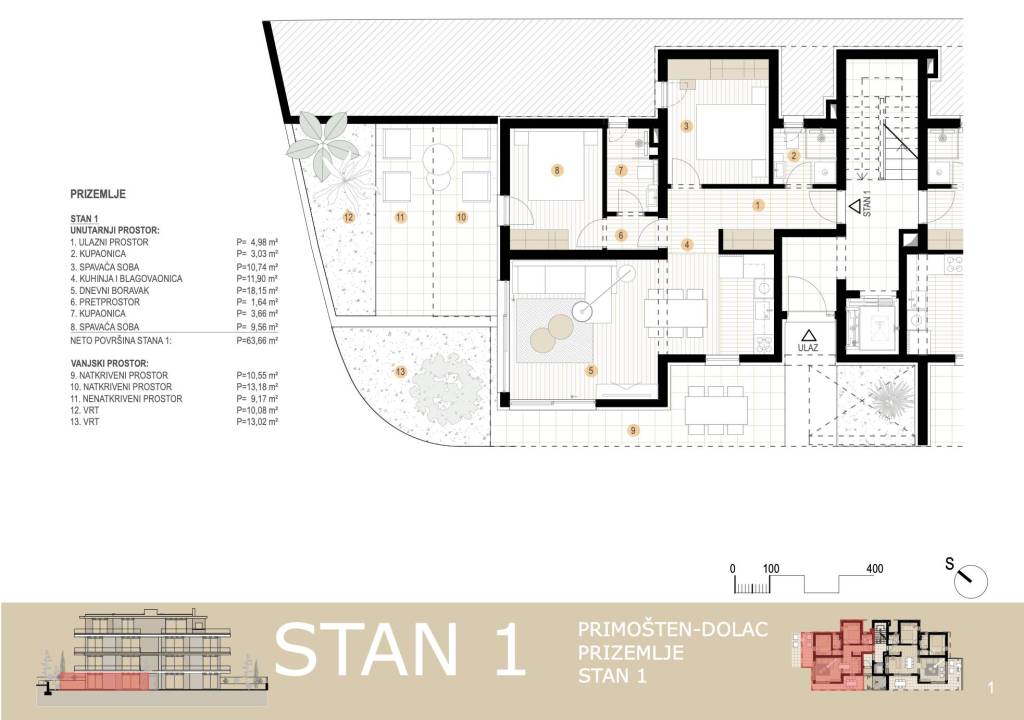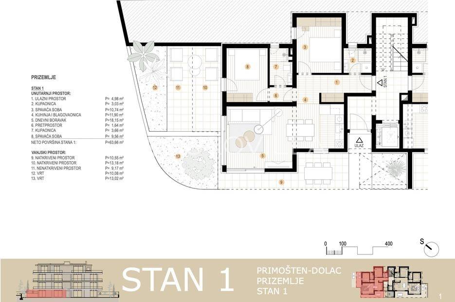 Moderan stan u prizemlju s vrtom, smješten u drugom redu do mora, ukupne neto korisne površine 83,26 m². Stanu pripada jedno parkirno mjesto, a zatvoreni stambeni prostor iznosi 63,66 m².Stan se sastoji od dnevnog boravka s kuhinjom i blagovaonicom, dvije spavaće sobe - od kojih jedna ima privatnu kupaonicu - te dodatne kupaonice. Iz dnevnog boravka izlazi se na prostranu terasu od 22 m² s prekrasnim pogledom na more, kao i na bočnu terasu površine 10,5 m². Stanu pripada i vrt od 23 m², idealan za opuštanje, jacuzzi, lounge zonu ili privatni mediteranski kutak.Stan se prodaje nenamješten, spreman za personalizaciju prema ukusu budućeg vlasnika.Lokacija je jedna od najvećih prednosti ove nekretnine - more je udaljeno svega 50 metara, a zahvaljujući konfiguraciji terena i prostornoj situaciji, pogled na more je trajan i nije ga moguće zagraditi, što ovaj stan čini iznimno vrijednim i dugoročno atraktivnim.Zgrada je novogradnja visoke kvalitete, a stanovi su opremljeni:podnim grijanjem u kupaonicama i boravku,ALU stolarijom s IZO staklom,električnim roletama,protuprovalnim vratima,klimatizacijom u svakoj sobi.Ovaj stan predstavlja odličnu priliku za one koji žele komfornu, modernu i dugoročno sigurnu investiciju, bilo za život, odmor ili turistički najam.Za sve dodatne informacije i dogovor razgledavanja, stojimo na raspolaganju.... Više na eurovilla.hr, ID: 131713