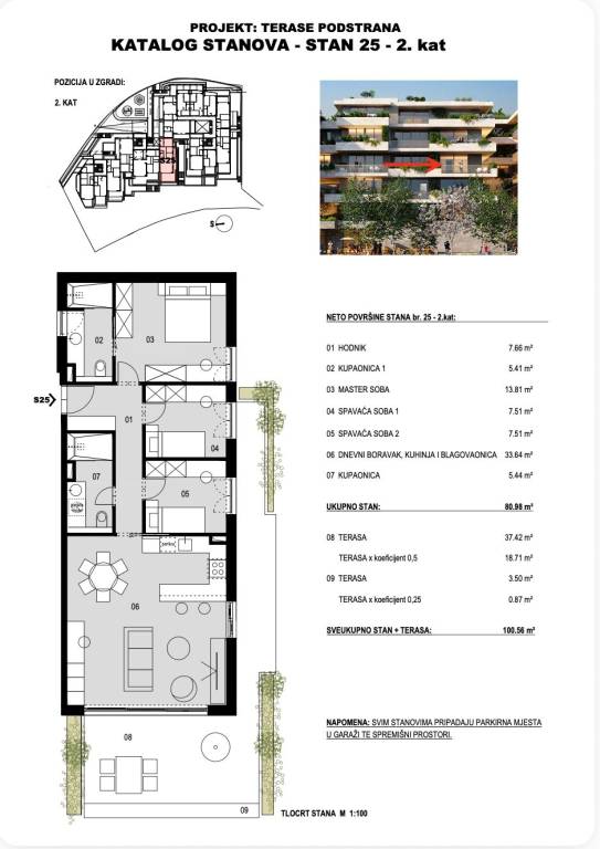 TERASE PODSTRANA | Ekskluzivan projekt novogradnje uz moreSplit - Podstrana | Luksuzna stambeno-poslovna zgrada suvremenog dizajnaProjekt TERASE u Podstrani predstavlja ekskluzivnu novogradnju smještenu na jednoj od najatraktivnijih mikrolokacija . Riječ je o luksuznoj stambeno-poslovnoj zgradi s ukupno 57 stambenih jedinica, projektiranoj i građenoj prema najvišim standardima kvalitete, s posebnim naglaskom na moderan, funkcionalan i suvremen način života. Planirano useljenje predviđeno je u drugoj polovici 2028. godine.STAN 25- trosoban stan smješten na drugom katu zgrade, zatvorene površine 80, 98 m², kojem dodatnu vrijednost daje natkrivena terasa površine 40, 92 m². Funkcionalan raspored prostora obuhvaća ulazni hodnik, tri spavaće sobe od kojih je jedna s pripadajućom kupaonicom, odvojenu kupaonicu, te dnevni boravak s blagovaonicom i kuhinjom otvorenog tlocrta s izlazom na terasu koja okružuje stan.U cijenu stana uključena su dva garažna parkirna mjesta ukupne površine 30 m² te spremište površine 4 m², dok ukupna obračunska površina stana iznosi 117, 56 m². Stan će biti opremljen vrhunskom opremom koja uključuje dizalicu topline, podno grijanje cijelog stana, klimatizaciju u svim prostorijama, ALU stolariju, protuprovalna ulazna vrata, parket prve klase te visokokvalitetnu keramiku i sanitarnu opremu.Nekretnina se nalazi svega 200 metara od mora, neposredno iznad hotela Le Méridien Lav, u blizini svih potrebnih sadržaja, što ovu lokaciju čini idealnim izborom za ugodan i kvalitetan život ili investiciju.Za sve dodatne informacije stojimo na raspolaganju.... Više na eurovilla.hr, ID: 487352