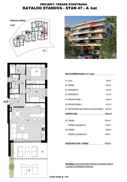 TERASE PODSTRANA | Ekskluzivan projekt novogradnje uz moreSplit - Podstrana | Luksuzna stambeno-poslovna zgrada suvremenog dizajnaProjekt TERASE u Podstrani predstavlja ekskluzivnu novogradnju smještenu na jednoj od najatraktivnijih mikrolokacija . Riječ je o luksuznoj stambeno-poslovnoj zgradi s ukupno 57 stambenih jedinica, projektiranoj i građenoj prema najvišim standardima kvalitete, s posebnim naglaskom na moderan, funkcionalan i suvremen način života. Planirano useljenje predviđeno je u drugoj polovici 2028. godine.STAN 47- dvosoban stan na četvrtom katu zatvorene površine 65,61 m2, s terasama površine 32,85 m2.Stan se sastoji se od ulaznog hodnika, dnevnog boravka s blagovaonicom i kuhinjom otvorenog tlocrta s izlazom na terasu , dvije spavaće sobe i dvije kupaonice.U cijenu stana su uključena dva garažna parkirna mjesta ukupne površine 30 m2 i spremište površine 4 m2. Ukupno obračunski 94,57 m2.Vrhunska oprema: dizalica topline, podno grijanje, klimatizirana svaka prostorija, ALU stolarija, protuprovalna ulazna vrata, parket I. klase, vrhunska keramika i sanitarna oprema...Nalazi se na atraktivnoj mikrolokaciji , u drugom redu od mora , odmah iznad hotela Le Méridien Lav, te u neposrednoj blizini svih potrebnih sadržaja ( uređena plaža, restorani, beach bar , teniski tereni, Wellness centar, ... ).Za sve ostale informacije stojimo Vam na raspolaganju.... Više na eurovilla.hr, ID: 638694