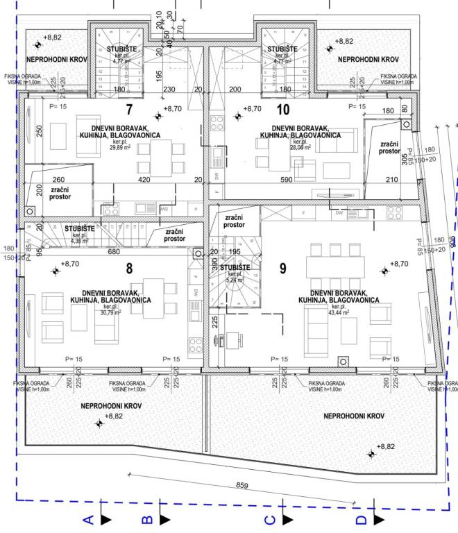 Predstavljamo Vam projekt novogradnje u poznatom turističkom odredištu na otoku Pagu, Povljani. Projekt se sastoji od dvije zgrade modernog dizajna od kojih svaka ima 10 stambenih jedinica raspoređenih na ukupno 4 etaže. Zgrade se nalaze na odličnoj i mirnoj lokacija koja je udaljena svega 250 metara od jedne od najpoznatijih plaža Povljane - Plaže Dubrovnik. U samom okruženju se nalaze i ostali sadržaji potrebni za kvalitetan život ili odmor.S8 - DRUGI KAT - DVOETAŽNI - 87,22m2Stan S8 se nalazi na 2. katu zgrade i potkrovlju te je ukupne neto korisne površine 87,22m2. Na prvoj etaži stana se nalazi hodnik (9,02m2 + 5,68m2), dvije spavaće sobe (10,71m2 i 10,39m2), potpuno opremljena kupaonica (4,16m2) i balkon s kojeg se pruža predivan pogled na more (18,18m2). Na drugoj etaži se nalazi otvoreni prostor kuhinje, blagovaonice i dnevnog boravka (30,79m2). Stanu uz to pripada i jedno vanjsko parkirno mjesto.Zgrada će biti spojena na svu komunalnu infrastrukturu, te je sva dokumentacija uredna.Prodavatelj je pravna osoba te je PDV uključen u cijenu stana!Od materijala i opreme izdvajamo:Termo izolaciju od kamene vune (10 cm), te završni sloj pročelja od ETICS fasadeVrhunska keramika visokog profilaVanjska antracit PVC low-e dvoslojna stolarijaAluminijske rolete na električno upravljanje i komarniciMulti split sustav klimatizacije u svim spavaćim sobama i dnevnom boravkuElektrično podne grijanje u kupaonicama i dnevnom boravkuLjestve radijatori u kupaonicamaVrhunska sanitarna oprema (Geberit, Hansgrohe)LiftI još mnogo toga..Povljana je mirno priobalno mjesto smješteno na južnom dijelu otoka Paga. Poznata je po dugim pješčanim plažama, čistom moru i opuštenom mediteranskom ugođaju. Idealna je destinacija za obiteljski odmor i život u mirnom okruženju.Za dodatne informacije i dogovor oko razgledavanja nekretnine, slobodno nas kontaktirajte... Više na eurovilla.hr, ID: 727240