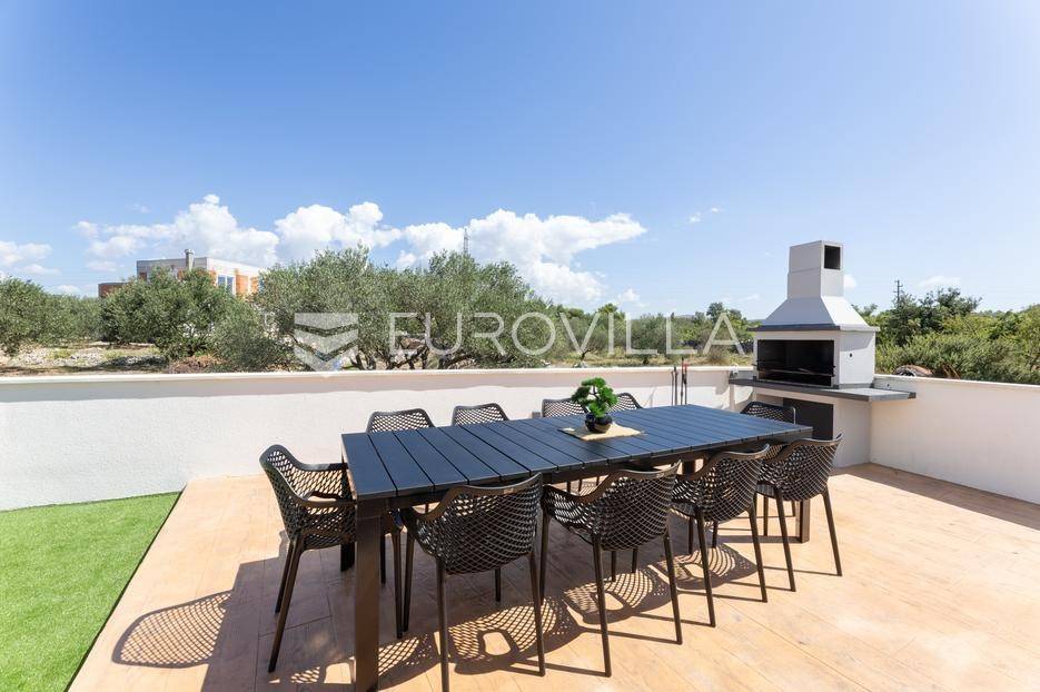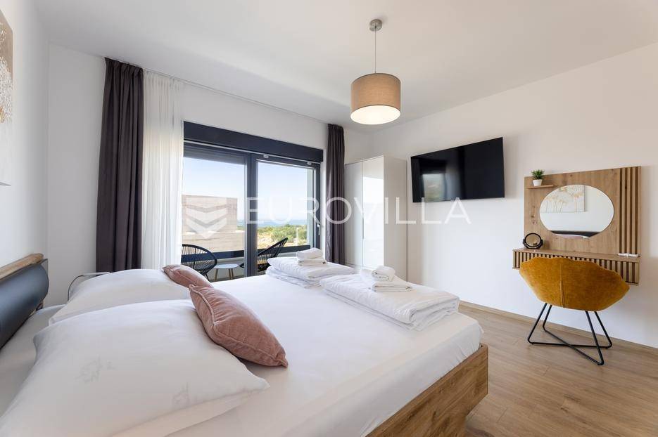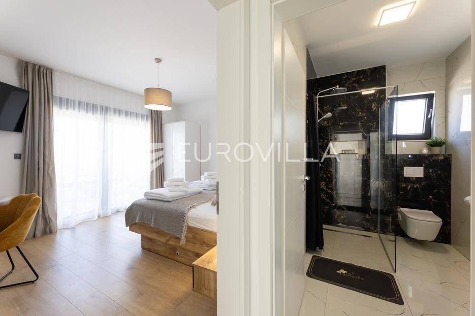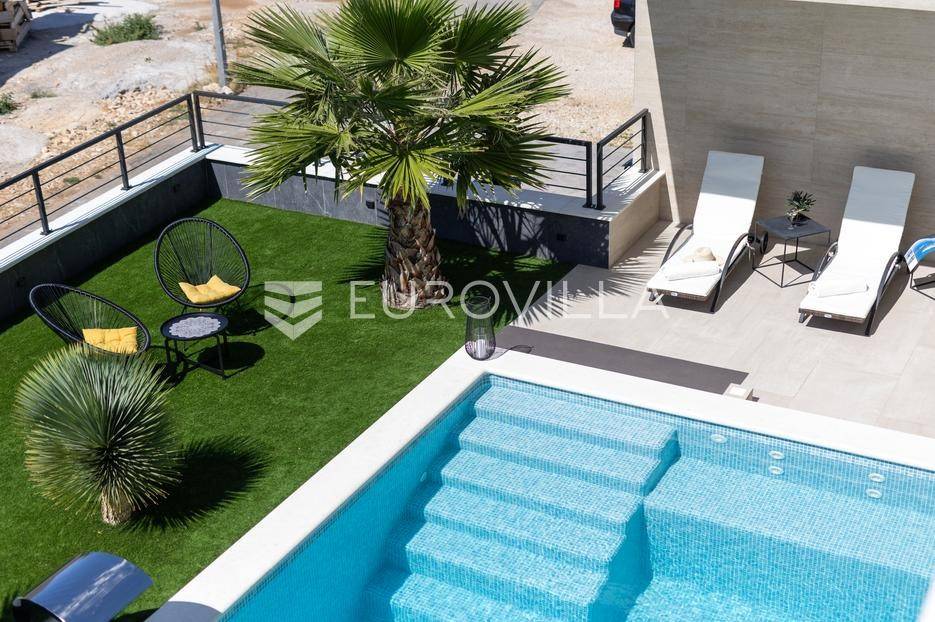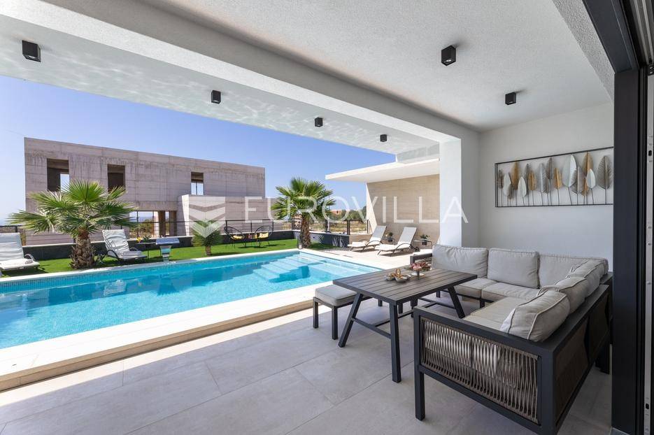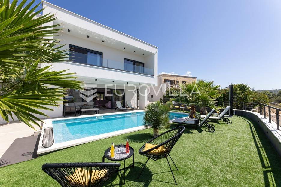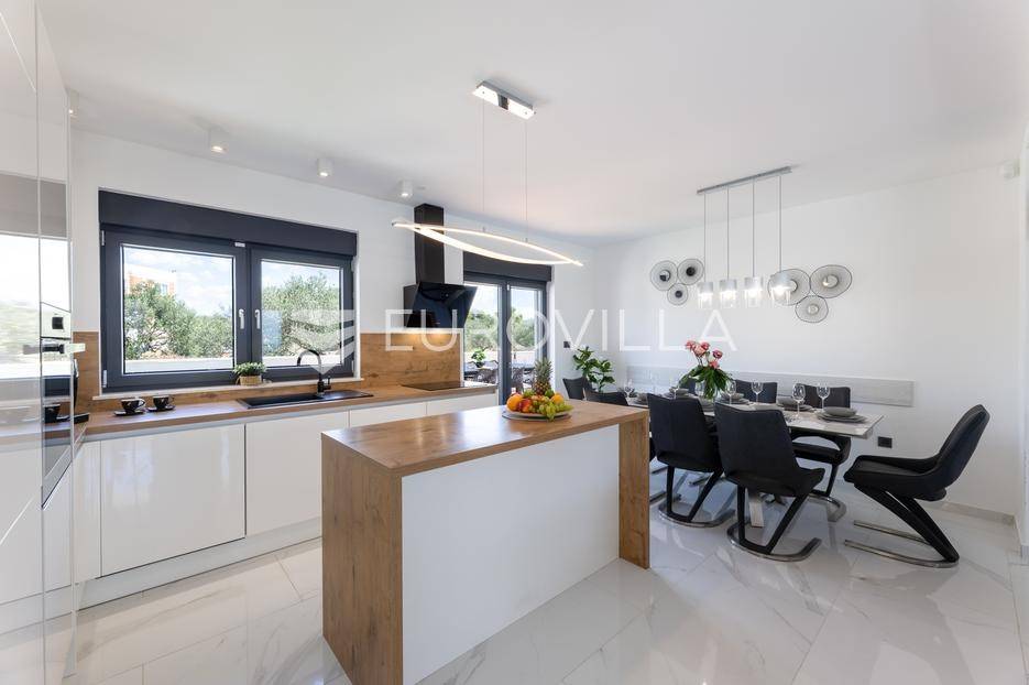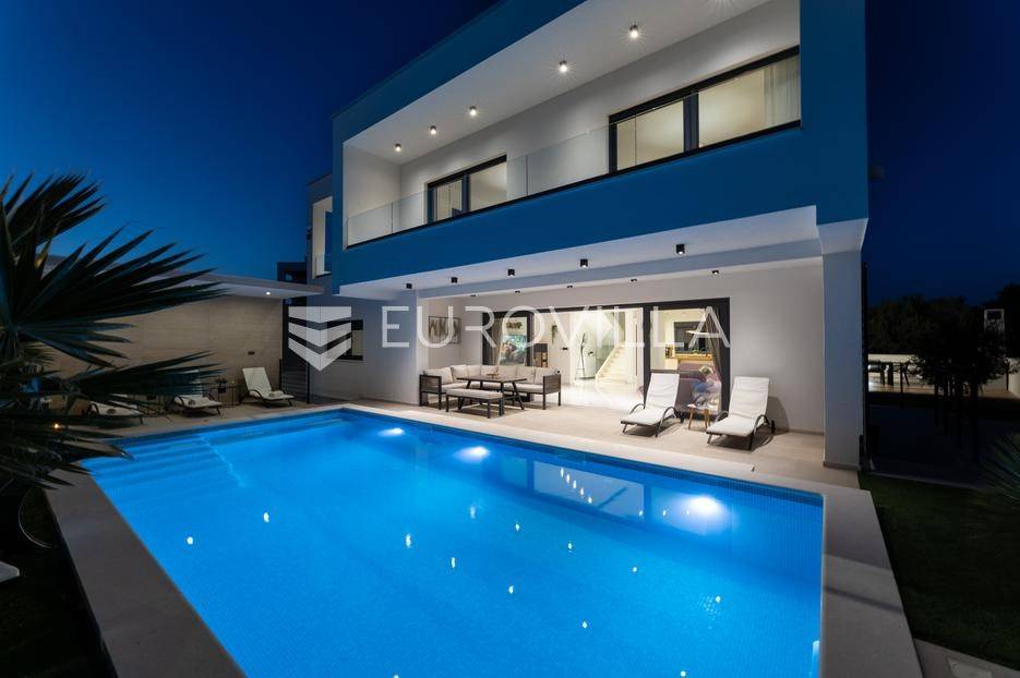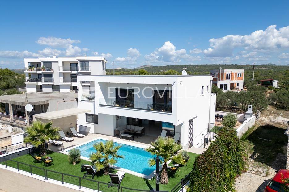Primošten, moderna vila s bazenom i pogledom na more površine 311,56 m². Izgrađena je 2024. godine. Prodaje se potpuno namještena i opremljena, te idealna za odmor ili turistički najam.Izgrađena na 3 etaže na parceli od 515 m². Sastoji se od prizemlja u kojem se nalazi dnevni boravak s kuhinjom i blagovaonicom, jedna spavaća soba s privatnom kupaonicom, te još jedna prostorija s toaletom i saunom. Dnevni boravak se otvara na prostranu natkrivenu terasu pokraj bazena. Unutarnjim stepenicama dolazimo na kat gdje se nalaze još 4 spavaće sobe, od kojih dvije imaju privatne kupaonice, te još jedna dodatna kupaonica. Tri spavaće sobe imaju pripadajuće balkone. S bočne strane kuće nalaze se stepenice kojima se spušta u praktični podrum ispod kuće.Vila je odlično opremljena, te su korišteni samo premium aparati i vrhunski namještaj. Bazen je opremljen sustavom za protustrujno plivanje.Oko vile se prostire lijep vrt, te prostor za sunčanje. Pokraj vile nalaze se 4 parkirna mjesta. Sa stražnje strane nalazi se roštilj i prostor za druženje i objedovanje. Mikrolokacija vile je odlična, na jako mirnom mjestu, te je udaljenost od mora 2200 metara.Sve ostale informacije na upit.... Više na eurovilla.hr, ID: 738007