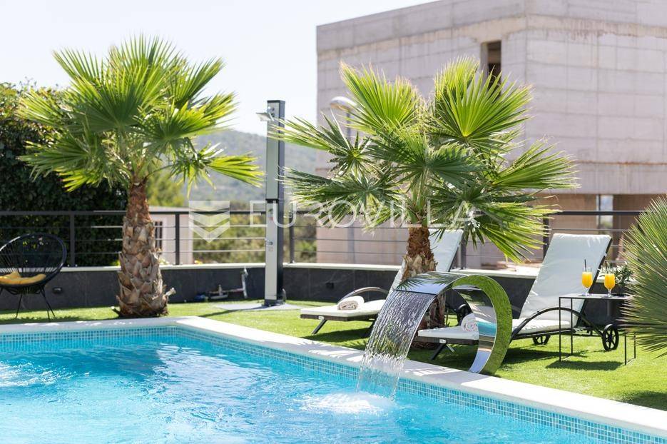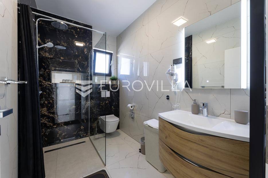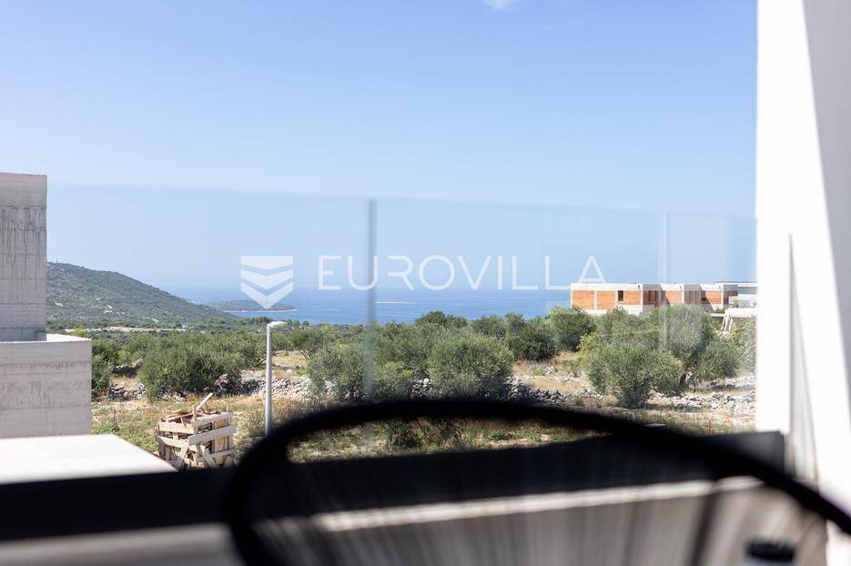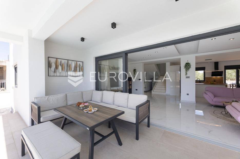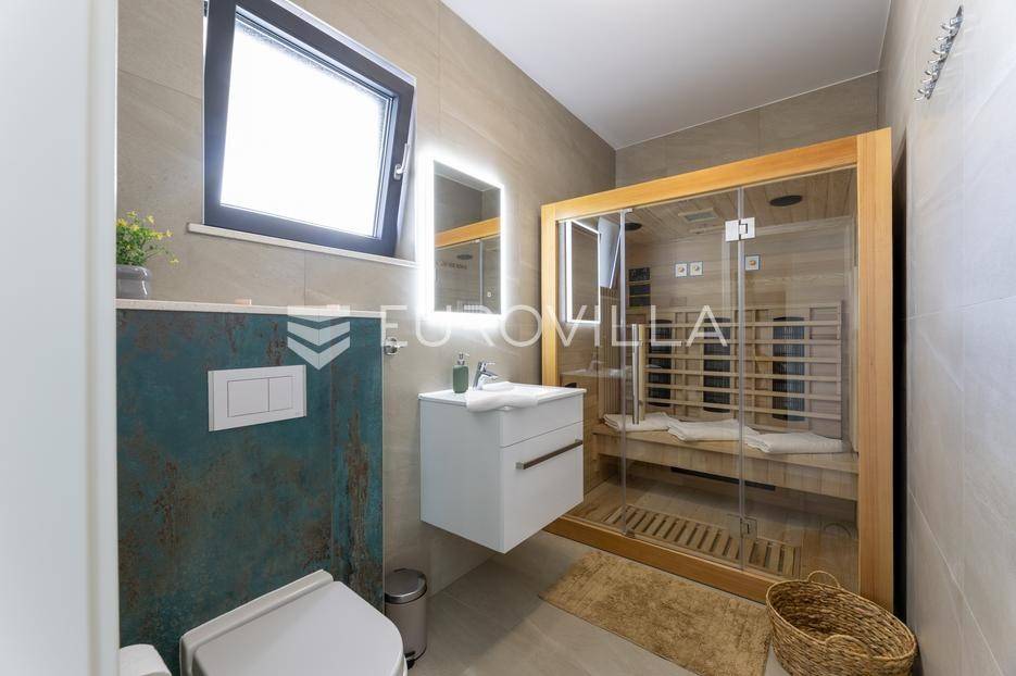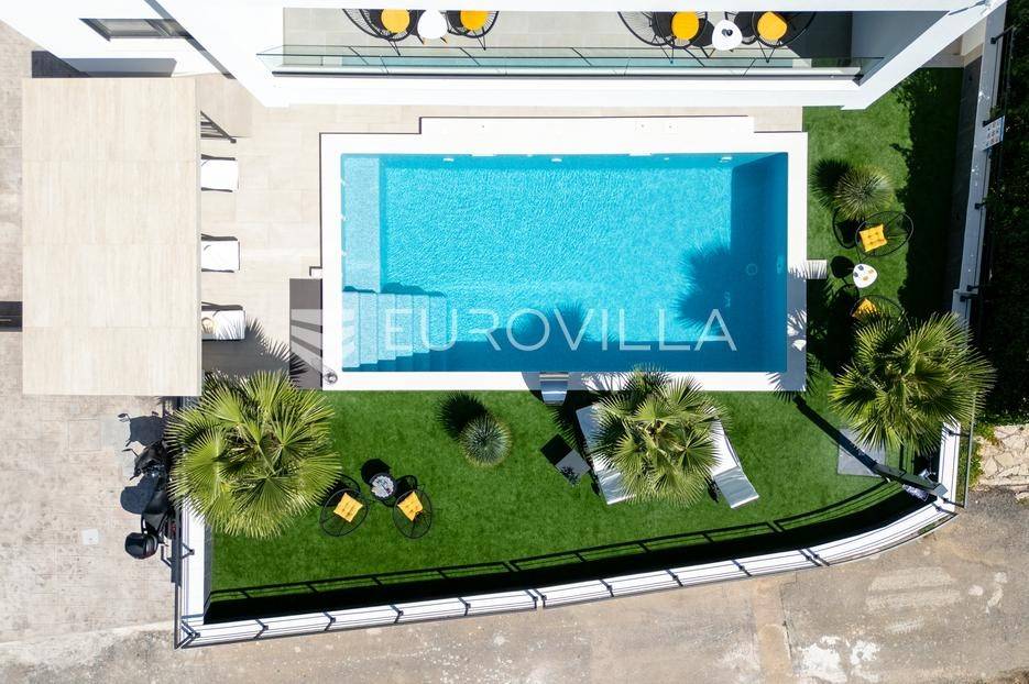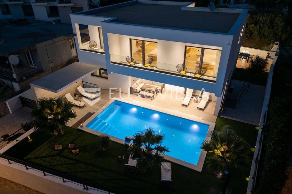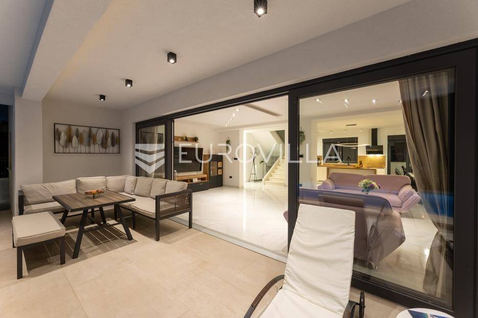 Primošten, moderna vila s bazenom i pogledom na more površine 311,56 m². Izgrađena je 2024. godine. Prodaje se potpuno namještena i opremljena, te idealna za odmor ili turistički najam.Izgrađena na 3 etaže na parceli od 515 m². Sastoji se od prizemlja u kojem se nalazi dnevni boravak s kuhinjom i blagovaonicom, jedna spavaća soba s privatnom kupaonicom, te još jedna prostorija s toaletom i saunom. Dnevni boravak se otvara na prostranu natkrivenu terasu pokraj bazena. Unutarnjim stepenicama dolazimo na kat gdje se nalaze još 4 spavaće sobe, od kojih dvije imaju privatne kupaonice, te još jedna dodatna kupaonica. Tri spavaće sobe imaju pripadajuće balkone. S bočne strane kuće nalaze se stepenice kojima se spušta u praktični podrum ispod kuće.Vila je odlično opremljena, te su korišteni samo premium aparati i vrhunski namještaj. Bazen je opremljen sustavom za protustrujno plivanje.Oko vile se prostire lijep vrt, te prostor za sunčanje. Pokraj vile nalaze se 4 parkirna mjesta. Sa stražnje strane nalazi se roštilj i prostor za druženje i objedovanje. Mikrolokacija vile je odlična, na jako mirnom mjestu, te je udaljenost od mora 2200 metara.Sve ostale informacije na upit.... Više na eurovilla.hr, ID: 738007
