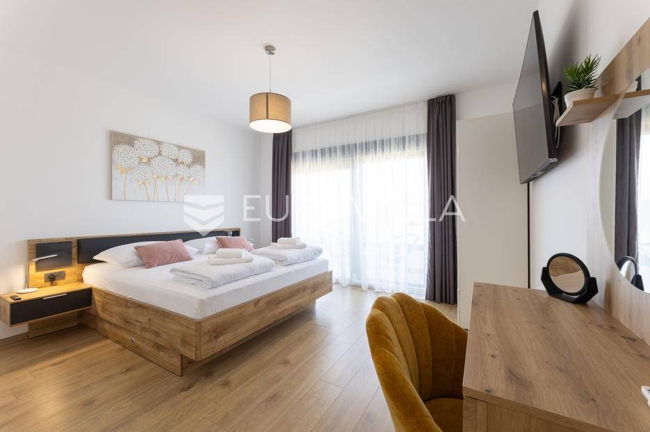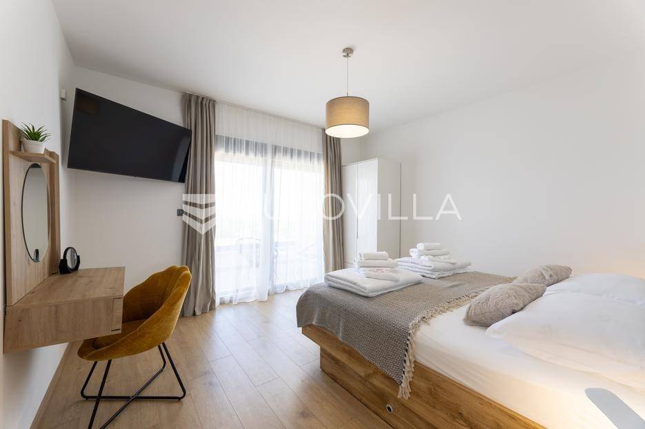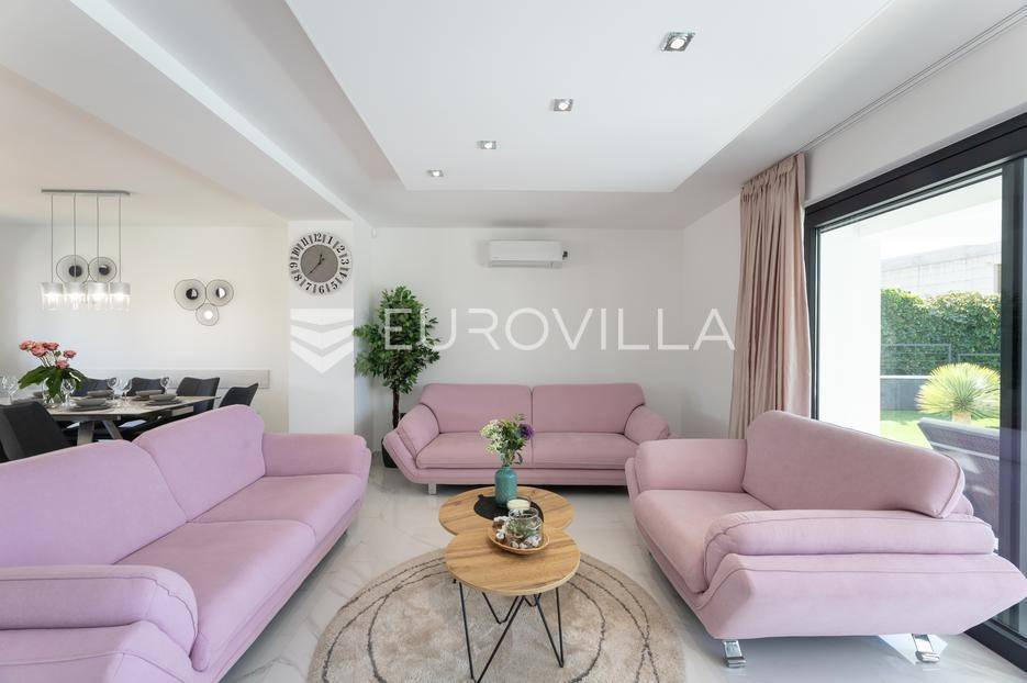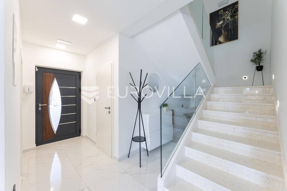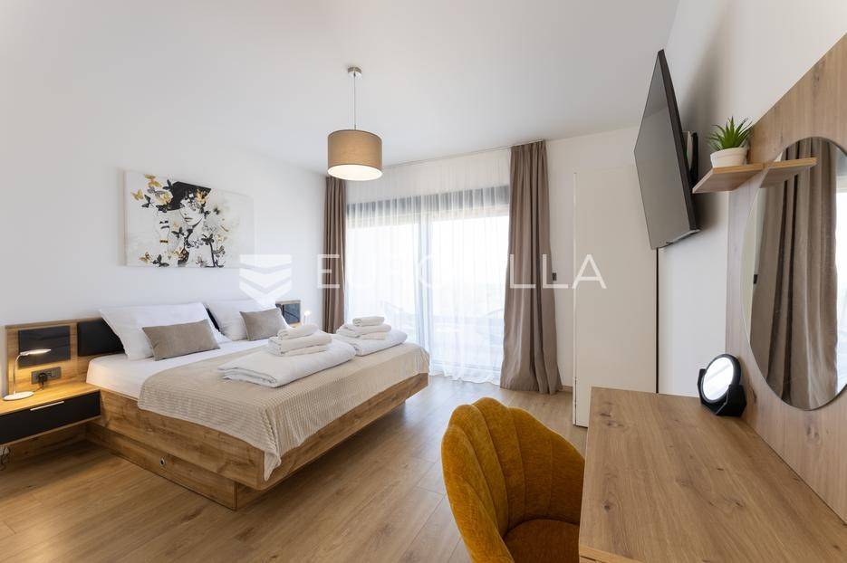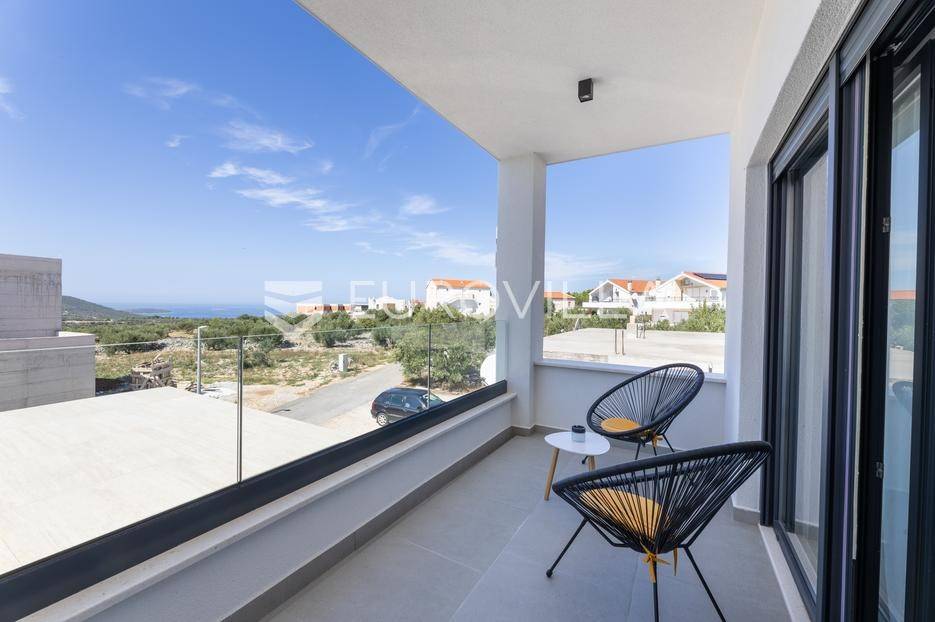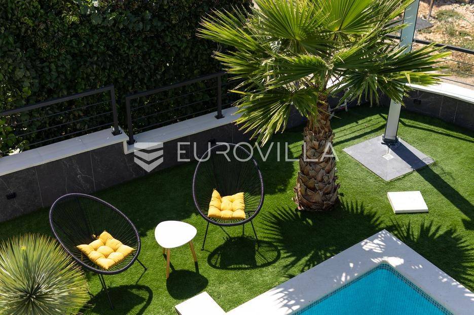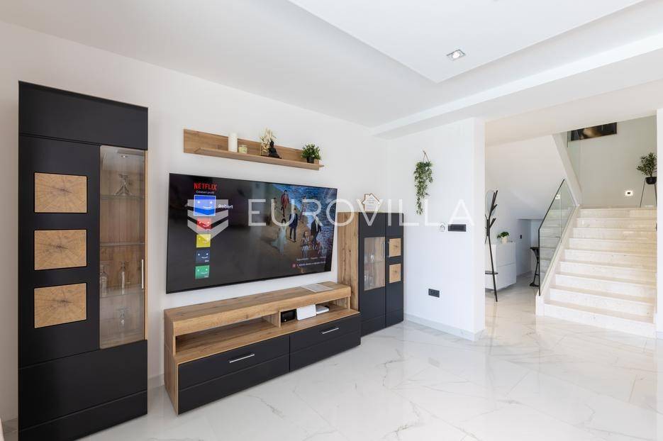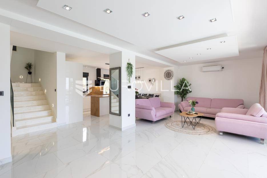 Primošten, moderna vila s bazenom i pogledom na more površine 311,56 m². Izgrađena je 2024. godine. Prodaje se potpuno namještena i opremljena, te idealna za odmor ili turistički najam.Izgrađena na 3 etaže na parceli od 515 m². Sastoji se od prizemlja u kojem se nalazi dnevni boravak s kuhinjom i blagovaonicom, jedna spavaća soba s privatnom kupaonicom, te još jedna prostorija s toaletom i saunom. Dnevni boravak se otvara na prostranu natkrivenu terasu pokraj bazena. Unutarnjim stepenicama dolazimo na kat gdje se nalaze još 4 spavaće sobe, od kojih dvije imaju privatne kupaonice, te još jedna dodatna kupaonica. Tri spavaće sobe imaju pripadajuće balkone. S bočne strane kuće nalaze se stepenice kojima se spušta u praktični podrum ispod kuće.Vila je odlično opremljena, te su korišteni samo premium aparati i vrhunski namještaj. Bazen je opremljen sustavom za protustrujno plivanje.Oko vile se prostire lijep vrt, te prostor za sunčanje. Pokraj vile nalaze se 4 parkirna mjesta. Sa stražnje strane nalazi se roštilj i prostor za druženje i objedovanje. Mikrolokacija vile je odlična, na jako mirnom mjestu, te je udaljenost od mora 2200 metara.Sve ostale informacije na upit.... Više na eurovilla.hr, ID: 738007