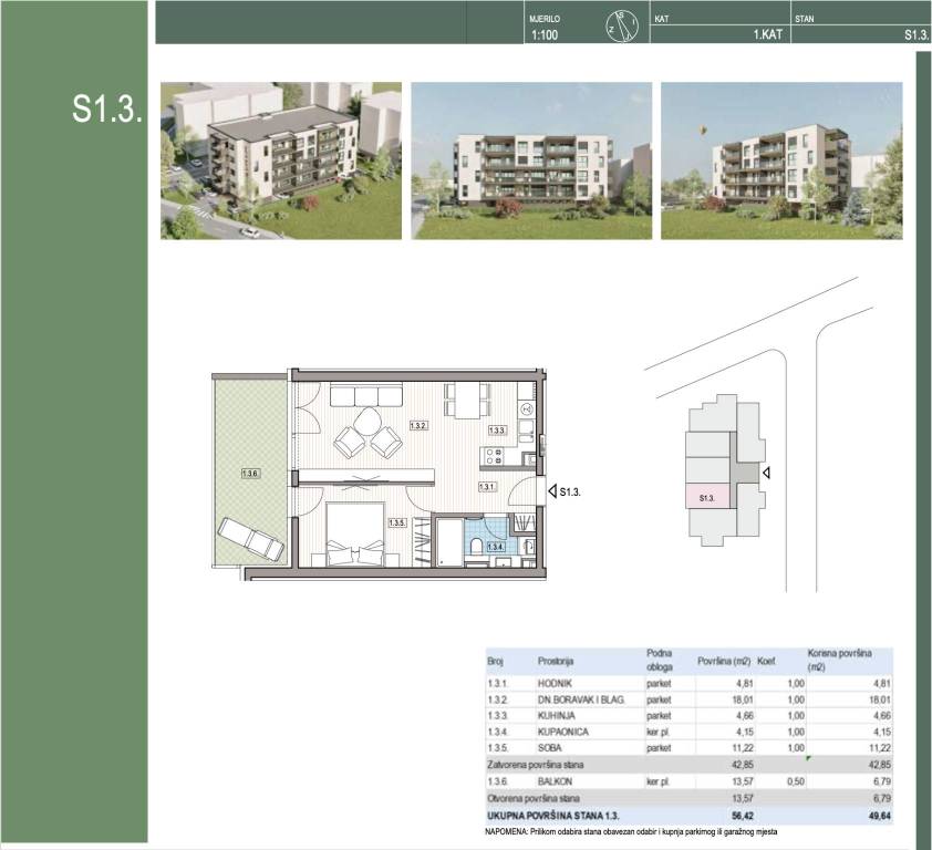 Dvosoban stan na 1. katu stambene zgrade zatvorene površine 42,85 m2 s balkonom 13,57 m2 (6,79 m2), ukupno neto korisne površine 49,64 m2.Stan S-1-3 sastoji se od ulaznog prostora, dnevnog boravka s blagovaonicom, kuhinje, kupaonice, spavaće sobe i natkrivenog balkona.Obavezna kupnja vanjskog ili garažnog parkirnog mjesta i ostave.Stan se nalazi u višestambenoj zgradi koji sadrži 26 moderno opremljene stambene jedinice. Moderna i kvalitetna novogradnja u mirnoj i tihoj ulici.U neposrednoj blizini nalazi se specijalna bolnica za medicinsku rehabilitaciju, Aquae Vivae - moderan vodeni park i wellness centar, trgovine, škole, vrtići i ambulante, kafići, restorani i šetnice.Useljenje 05/2027. godineOstale informacije na upit.... Više na eurovilla.hr, ID: 795492