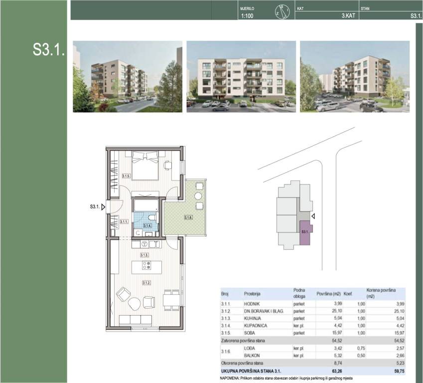 Dvosoban stan na 3. katu stambene zgrade zatvorene površine 54,52 m2 s loggiom 3,42 m2 (2,57 m2) i balkonom 5,32 m2 (2,66 m2), ukupno neto korisne površine 59,75 m2.Stan S-3-1 sastoji se od ulaznog prostora, dnevnog boravka s blagovaonicom, kuhinje, kupaonice, spavaće sobe i loggie/balkona.Obavezna kupnja vanjskog ili garažnog parkirnog mjesta i ostave.Stan se nalazi u višestambenoj zgradi koji sadrži 26 moderno opremljene stambene jedinice. Moderna i kvalitetna novogradnja u mirnoj i tihoj ulici.U neposrednoj blizini nalazi se specijalna bolnica za medicinsku rehabilitaciju, Aquae Vivae - moderan vodeni park i wellness centar, trgovine, škole, vrtići i ambulante, kafići, restorani i šetnice.Useljenje 05/2027. godineOstale informacije na upit.... Više na eurovilla.hr, ID: 979323