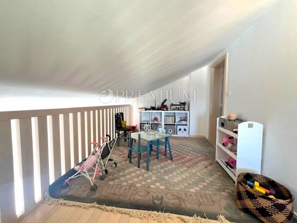 The layout comprises an entrance area, bathroom, three bedrooms, kitchen with dining area and living room with access to a loggia offering an open sea view. Two children’s rooms are located on the gallery, making the space functional and well suited for family life.