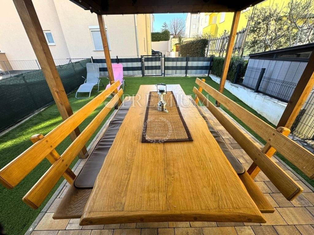 The apartment is well maintained and equipped with PVC windows, custom-made furniture, a security door and satellite TV. Heating is provided by a pellet stove and air conditioning, allowing comfortable year-round use.