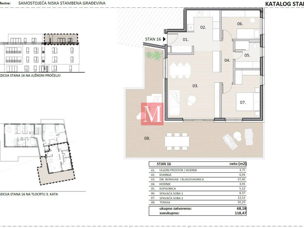 Modern penthouse in a prime location in Donja Dubrava with a terrace and one parking space. The apartment consists of an entrance hall, kitchen, living room and dining room, bathroom, 2 bedrooms, terrace and one parking space. The apartment is located in close proximity to all amenities needed for quality everyday life: bus station 250 m Trnava Health Center 300 m Jabuka kindergarten 350 m new elementary school (under construction) 350 m neighborhood shops, cafes and restaurants 200300 m train station (Branimirova) and Borongaj campus nearby City East Shopping Center a few minutes Excellent transport connections and developed infrastructure further increase the value of this location. Apartment 68.18 m2, + 50.29 m2 terrace with parking space included in the price. No agency commission for the buyer.