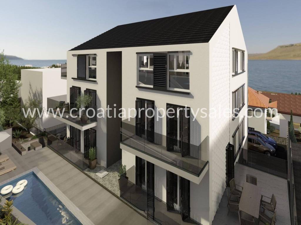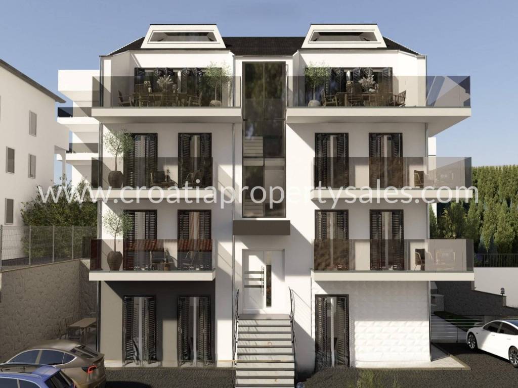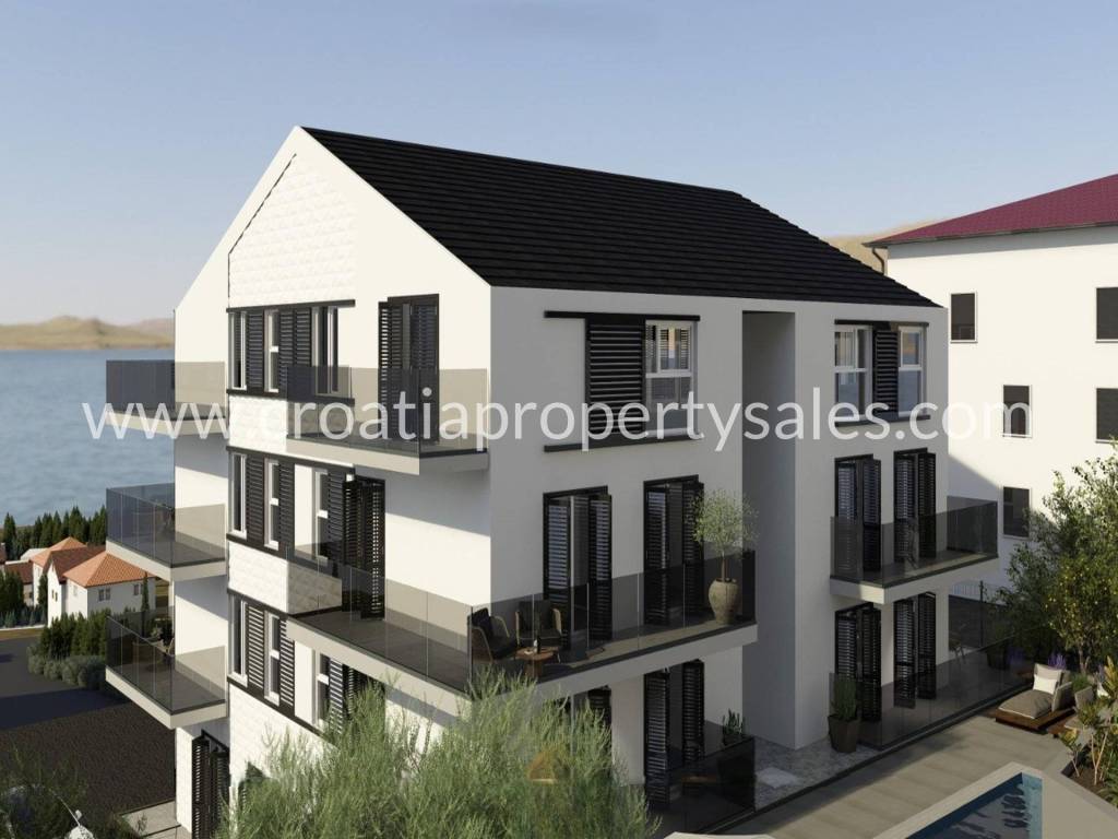 A new construction located on Čiovo island, which is currently under construction. It is a larger building, that will have 4 floors in total and 12 apartments.