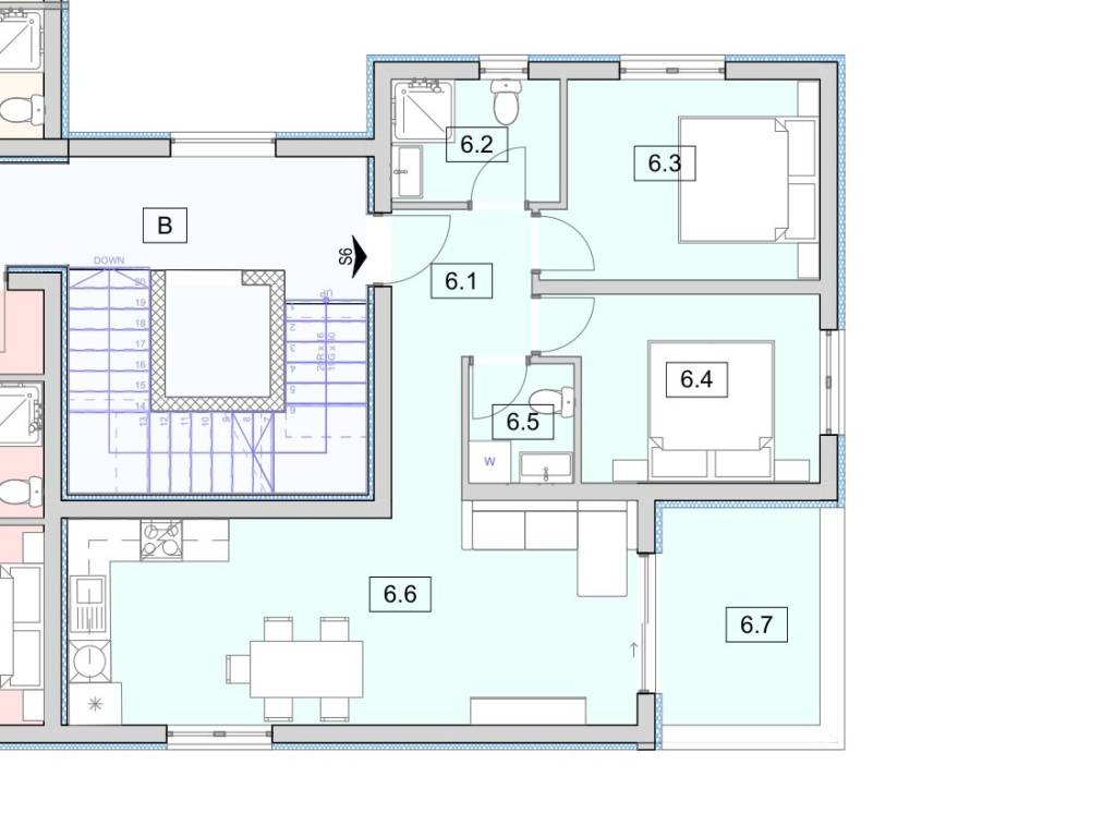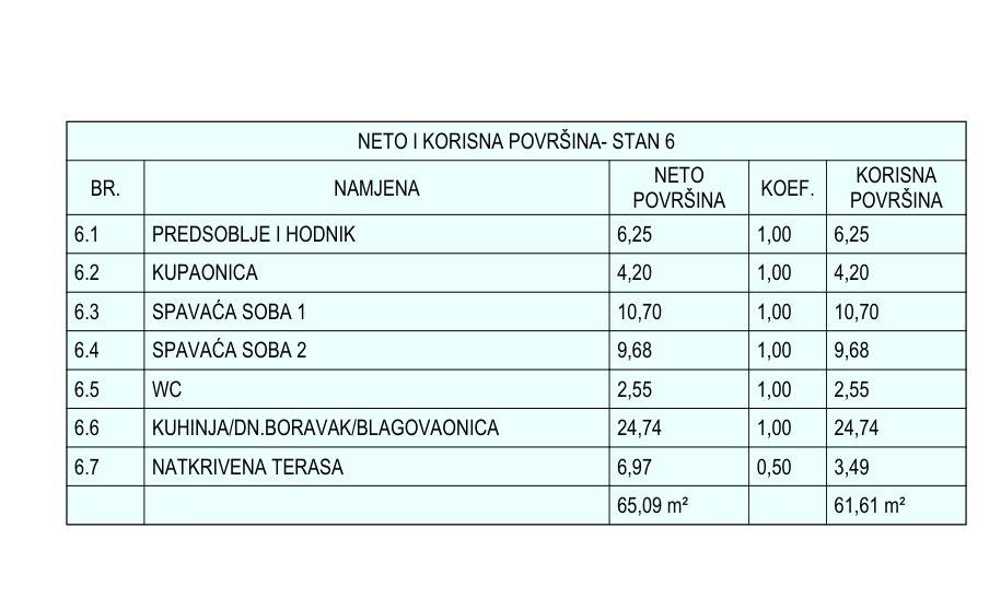 Stan S6 I.kat - ukupne korisne površine 64,61 m2 (stambena površina 58,12 m2 + terasa 6,97 m2 + parking) nalazi se na 1. katu. Sastoji se od hodnika, predsoblja, kupaonice, WC-a, dvije spavaće sobe, kuhinje s blagovaonicom, dnevnog boravka s izlazom na lijepu natkrivenu terasu površine 6,97 m2 s koje se pruža lijepi pogled na more. Stanu pripada 1 parkirno mjesto - 258.440,00 eur