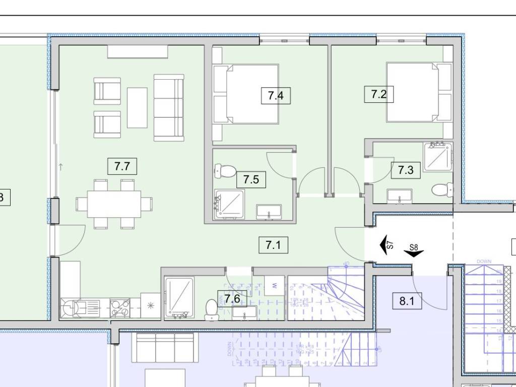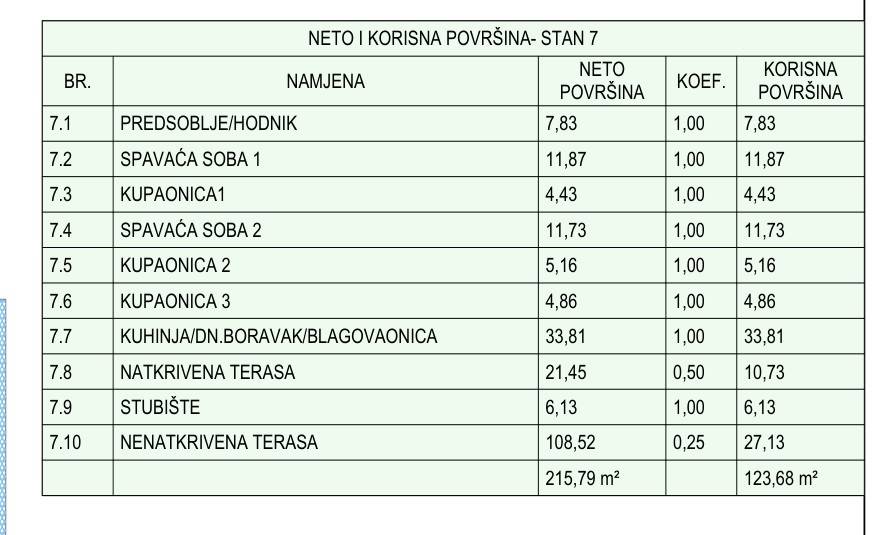 Stan S7- ukupne korisne površine 126,68 m2 (stambena površina 85,82 m2 + terasa 21,45 m2 + krovna terasa 108,52 m2 + parking) nalazi se na 2. katu. Sastoji se od hodnika, predsoblja, tri kupaonice, dvije spavaće sobe, kuhinje s blagovaonicom, dnevnog boravka s izlazom na natkrivenu terasu površine 21,45 m2 s koje se pruža lijepi pogled na more. Unutarnjim stubištem dolazimo na nenatkrivenu krovnu terasu površine 108,52 m2 s koje se pruža panoramski pogled na more, stanu pripada 1 parkirno mjesto - 557.392,00 eur.