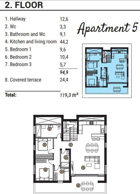 On the second floor of the building there is a spacious family apartment with a total area of 119.3 m². The apartment consists of an entrance hallway, a separate toilet, a bathroom with toilet, three bedrooms, and a very spacious living room with kitchen and dining area measuring 44.2 m². From the living area there is access to a large covered terrace of 24.4 m², providing an ideal space for socializing, outdoor dining, or relaxation.