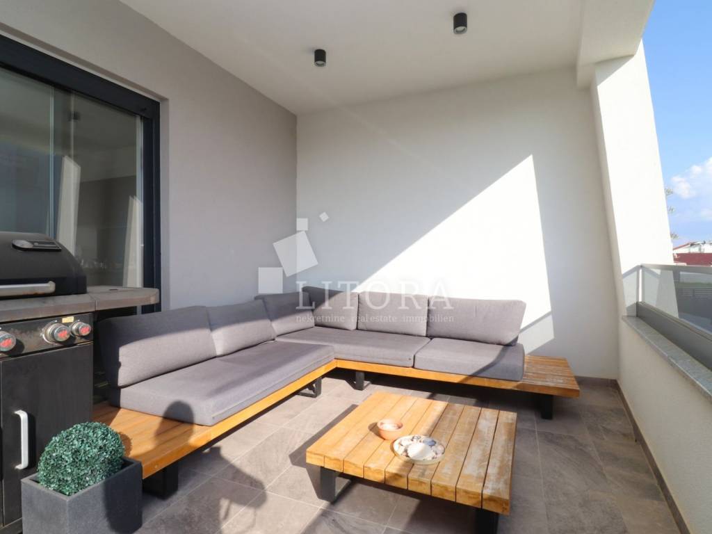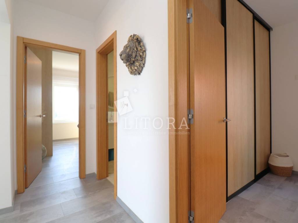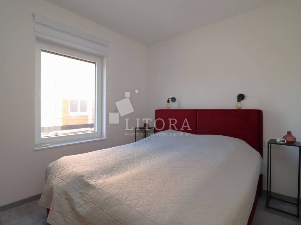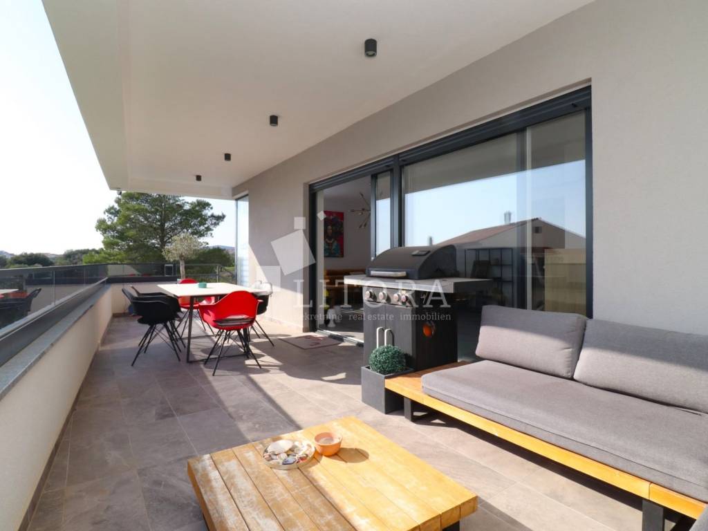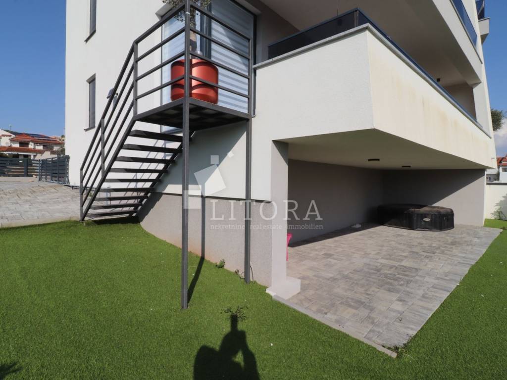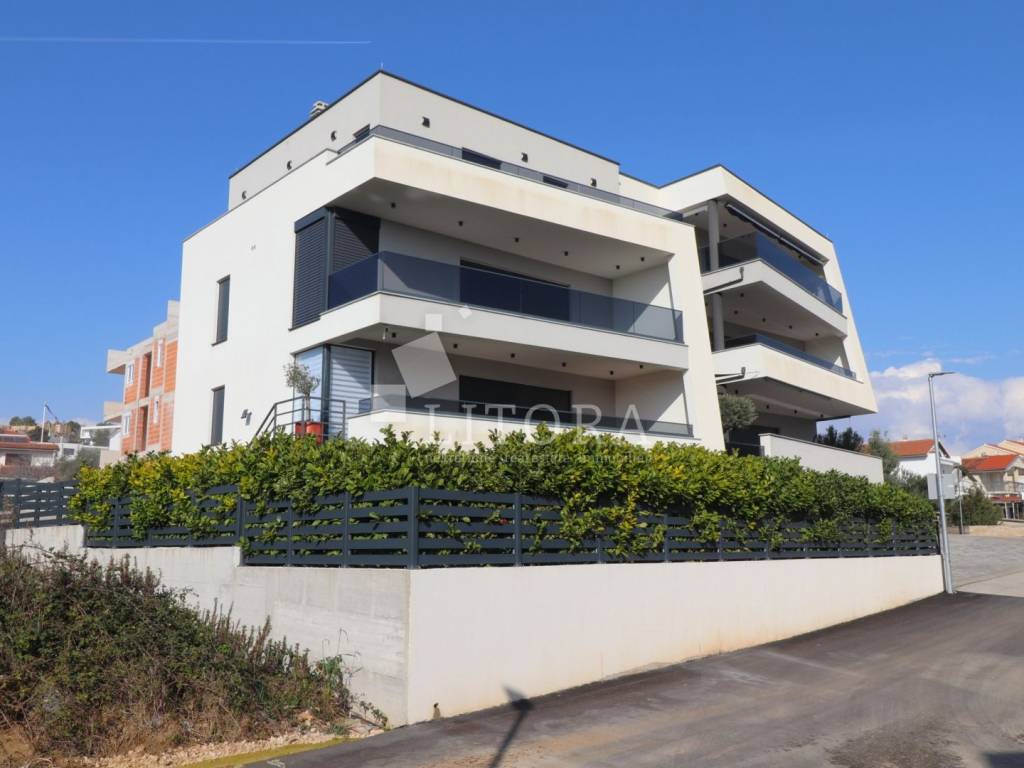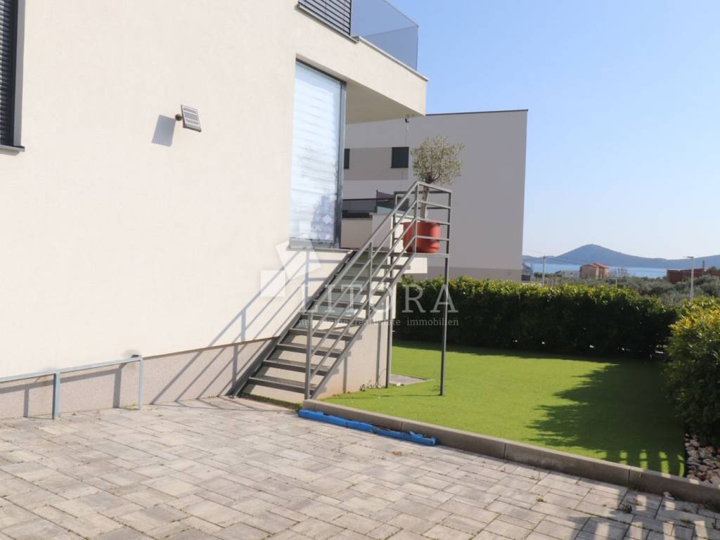 Located in a quiet area of Vodice, this fully furnished and equipped apartment with a beautiful sea view is only 400 meters from the beach. The apartment is situated on the elevated ground floor of a modern residential building. The apartment has a total usable area of 119.47 m². The living area of 94.59 m² consists of an entrance hallway, two bedrooms, a bathroom, an additional guest toilet, and a spacious living room with kitchen and dining area that opens onto a covered terrace with a sea view. The apartment also includes: a storage room in the basement of the building with a net area of 5.88 m², two outdoor parking spaces measuring 13.30 m² and 13.10 m², a private garden of 144 m². The apartment is equipped to modern standards, including: anthracite PVC windows and doors, electric roller shutters. security and fire-resistant entrance door, high-quality MDF interior doors, inverter air conditioning units in the bedrooms and living room, modern bathroom sanitary fittings. The spacious garden is enclosed by an anthracite metal fence combined with a green privacy hedge, providing additional privacy. All furniture is included in the price, making this property.