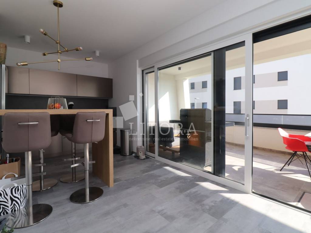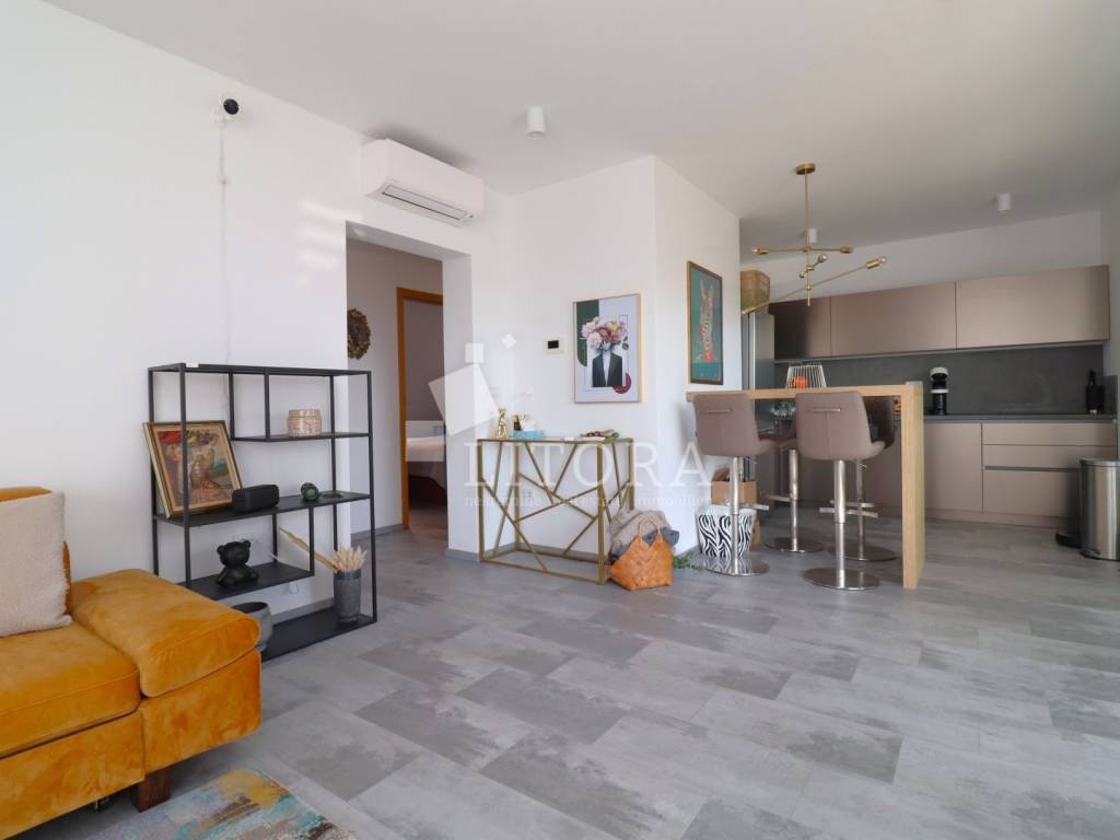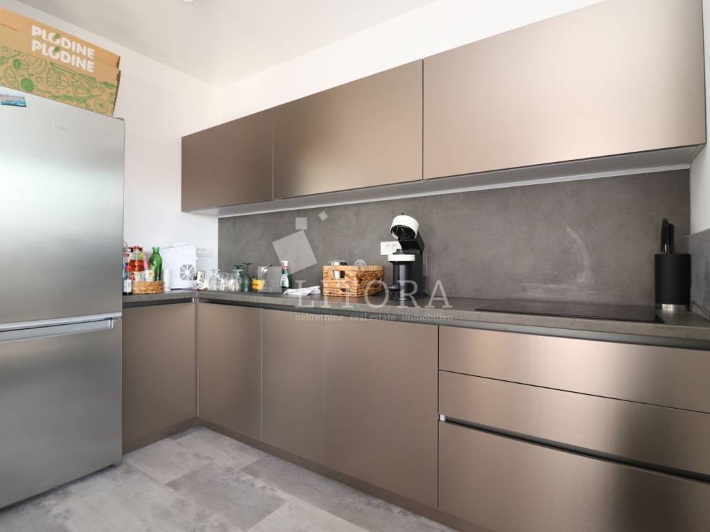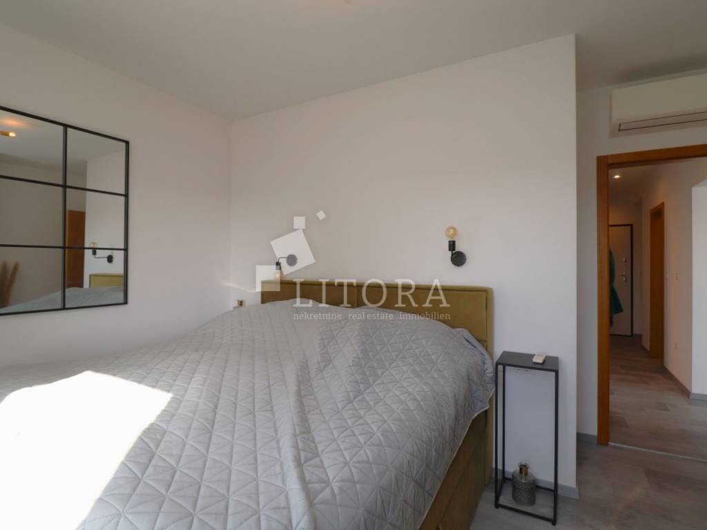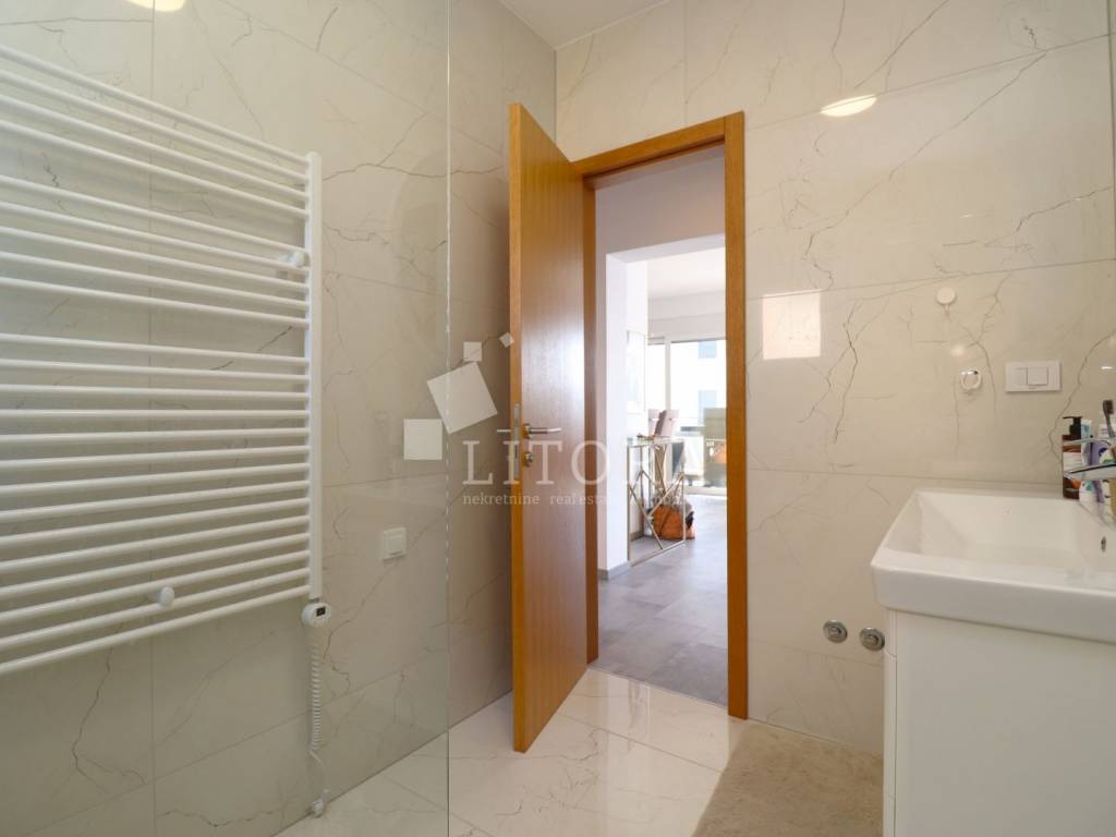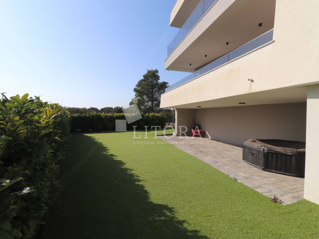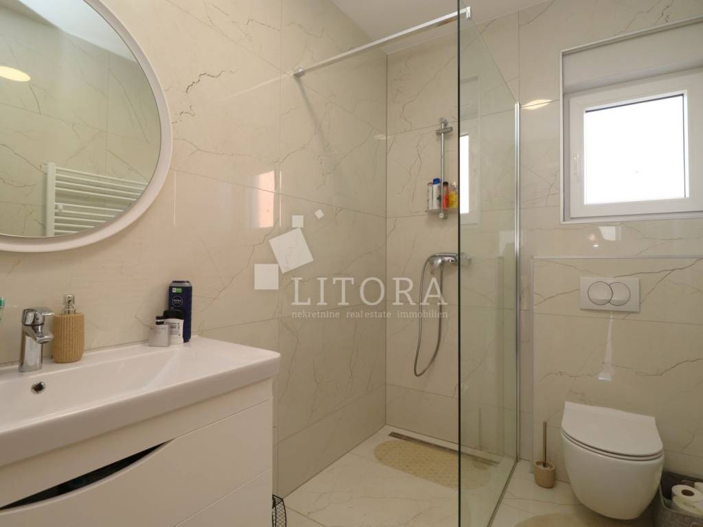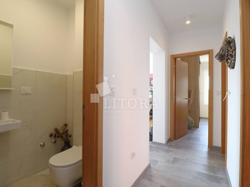 Located in a quiet area of Vodice, this fully furnished and equipped apartment with a beautiful sea view is only 400 meters from the beach. The apartment is situated on the elevated ground floor of a modern residential building. The apartment has a total usable area of 119.47 m². The living area of 94.59 m² consists of an entrance hallway, two bedrooms, a bathroom, an additional guest toilet, and a spacious living room with kitchen and dining area that opens onto a covered terrace with a sea view. The apartment also includes: a storage room in the basement of the building with a net area of 5.88 m², two outdoor parking spaces measuring 13.30 m² and 13.10 m², a private garden of 144 m². The apartment is equipped to modern standards, including: anthracite PVC windows and doors, electric roller shutters. security and fire-resistant entrance door, high-quality MDF interior doors, inverter air conditioning units in the bedrooms and living room, modern bathroom sanitary fittings. The spacious garden is enclosed by an anthracite metal fence combined with a green privacy hedge, providing additional privacy. All furniture is included in the price, making this property.