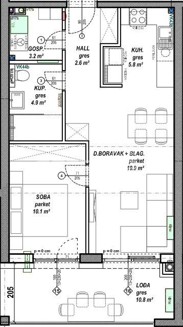 Prodaje se stan površine 46,50 m2 s lođom površine 10,80 m2 na prvom katu niskoenergetske stambeno - poslovne zgrade na odličnoj lokaciji. Zgrada se sastoji od podruma, prizemlja, prvog, drugog i trećeg kata te sadrži ukupno 108 stambenih jedinica i 2 poslovna prostora. Moguć je odabir podnih obloga (keramika, parket ili laminat) te odabir unutarnje stolarije. Uz stan moguća je kupovina vanjskog parkirnog mjesta, garažnog mjesta bez spremišta ili garažnog mjesta sa spremištem.