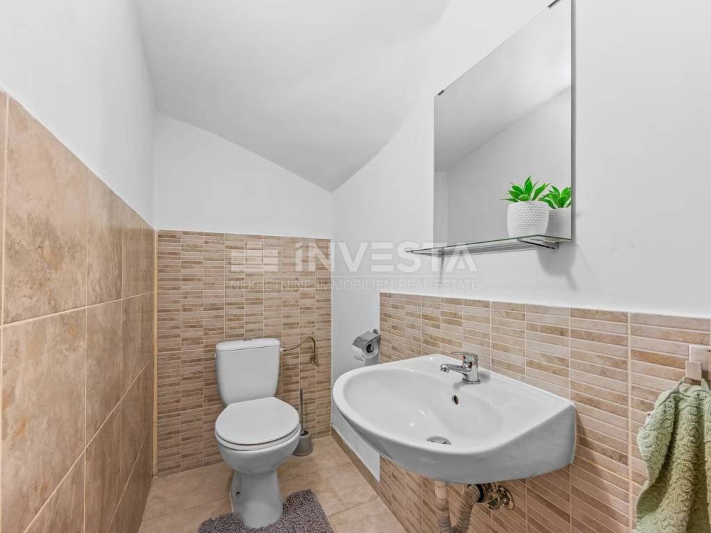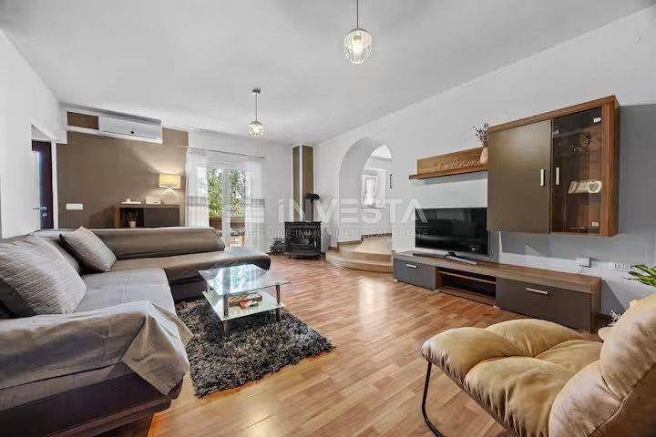 The ground floor has a spacious living room with a wood stove, a toilet, a kitchen with a dining area, and a pantry.