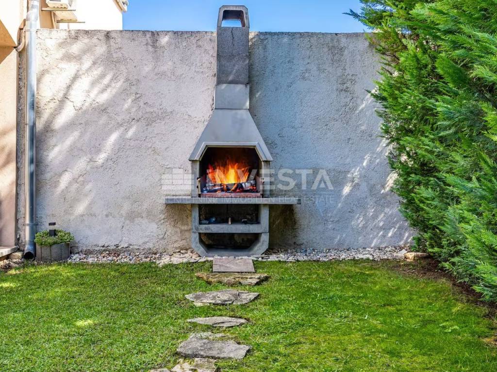 The 142 m² yard features a 28 m² swimming pool, sunbathing area, outdoor shower, barbecue, and a covered terrace with a dining table for socializing.