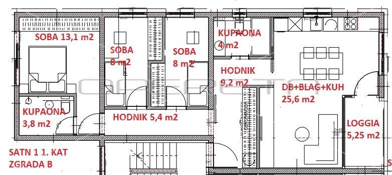 Primamo rezervacije za stan u novogradnji. Manja zgrada sa samo 4 stana. Stan se sastoji od " open space" dnevnog boravka, blagovaonice i kuhinje s izlazom na loggiu, tri sobe i kupaonice s wc-om. Trostrane je orijentacije.U cijeni je garaža, vanjsko parkirno mjesto i spremište od 7,5m2. Odlična lokacija na par minuta pješaćke udaljenosti od osnovne škole, trgovine i autobusne stanice, kao i do svih ostali sadržaja važnih za ugodan život. Useljenje 11/2026.