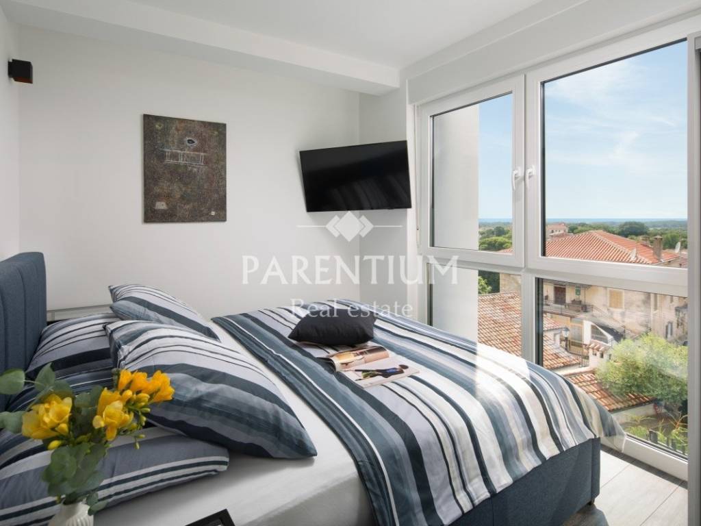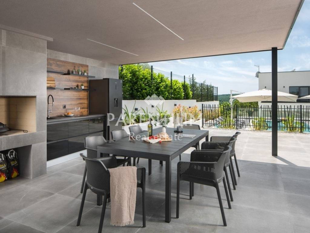 Located in a peaceful residential area near Vrsar, this fully furnished and equipped 203 m villa is for sale, only approx. 5 km from the sea and the centre of Vrsar. The property is arranged over basement, ground floor and first floor, offering 4 bedrooms, each with a private bathroom (1 on the ground floor + 3 upstairs), an additional guest WC, and a spacious open-plan living/dining area with large glass walls leading to a covered terrace and the pool area. Upstairs bedrooms and terraces offer an open sea and landscape view. The basement includes a game room with billiards and a PlayStation, as well as a utility room and storage.