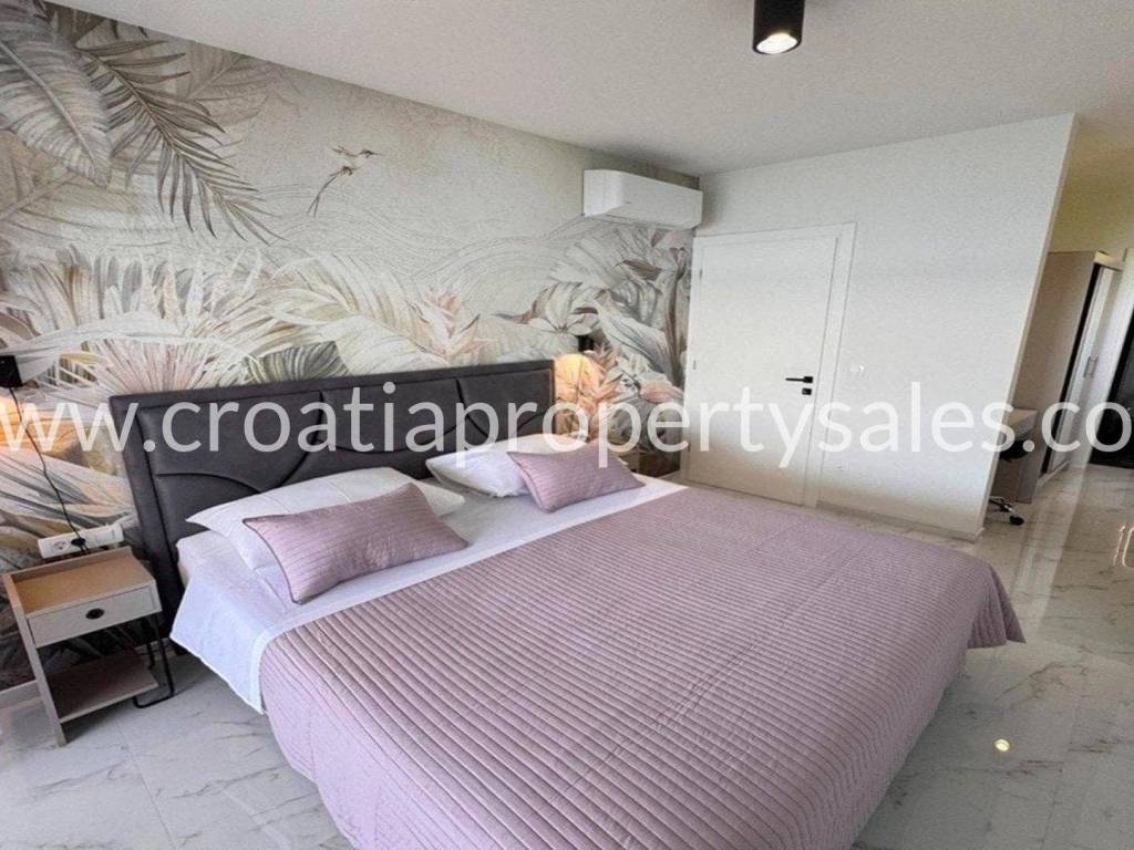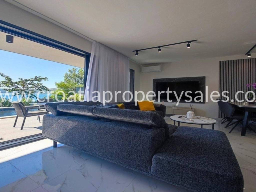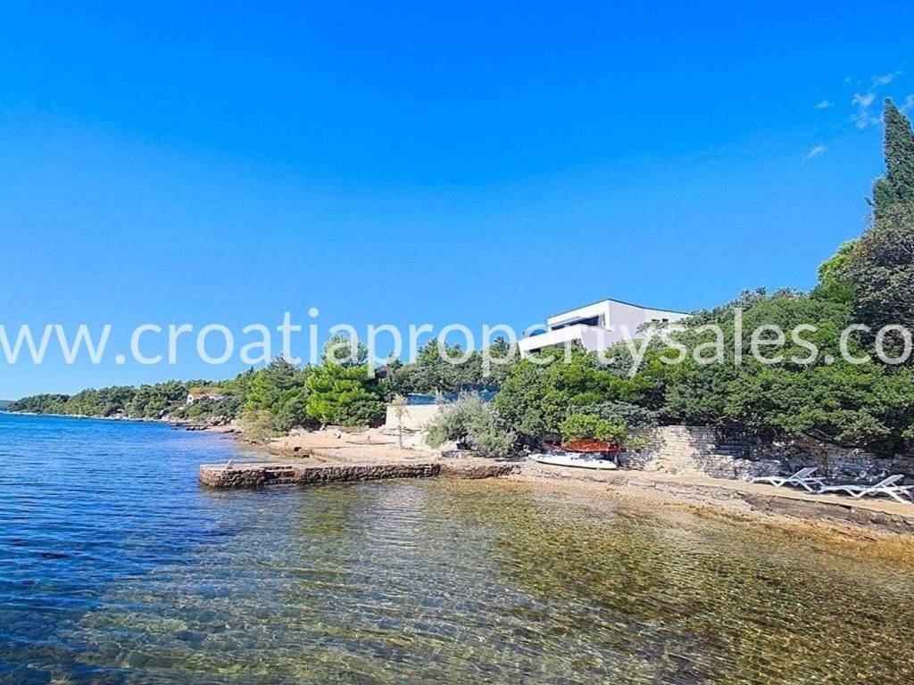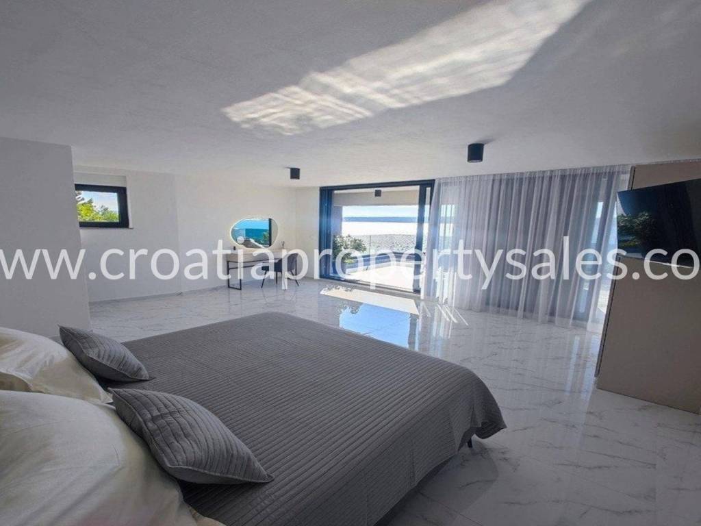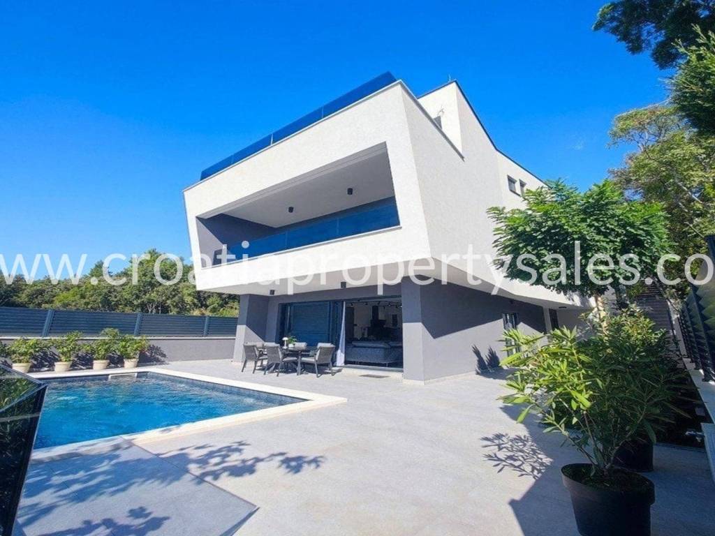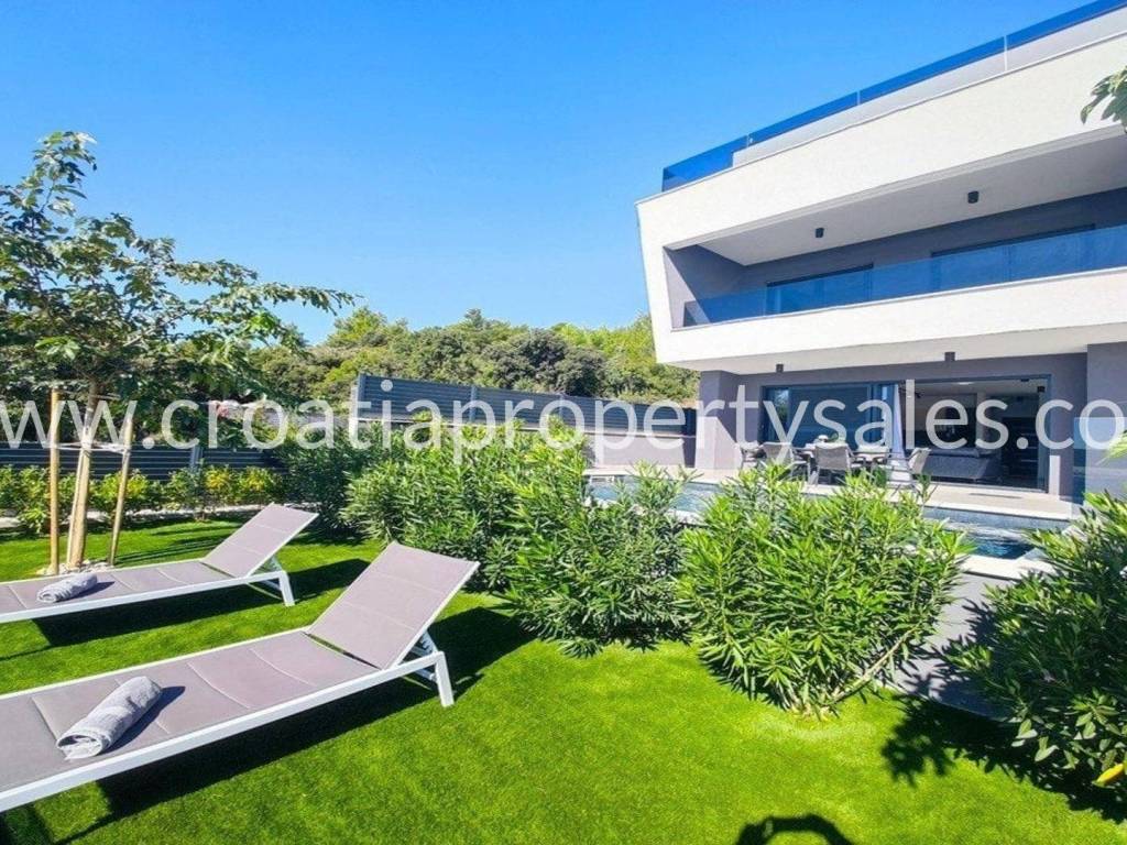 A unique modern villa in the first row in a quiet bay. There is no road between the villa and seafront and this location offers absolute peace and privacy and direct access to the beach.The outdoor area offers a swimming pool, a spacious sunbathing area, a lounge area and a grassy terrace with panoramic sea views.The villa spreads over three floors: The ground floor offers an open living room, kitchen and dining area with access to the terrace, wc and a multi-purpose room with a separate entrance that can be converted into a fitness, sauna or study room. The first floor has two large en-suite bedrooms and a shared terrace.The second floor offers a luxurious master bedroom with a private bathroom and large terrace with panoramic views over the sea.The villa is equipped with five air conditioners, underfloor heating in the bathrooms and solar panels. It is located close to all amenities and is excellently connected by the highway.The access to the villa is discreet and secured with private parking for several cars. Zadar airport is 28km away.
