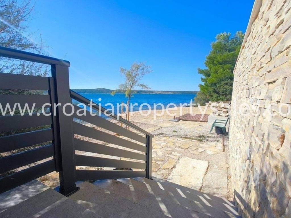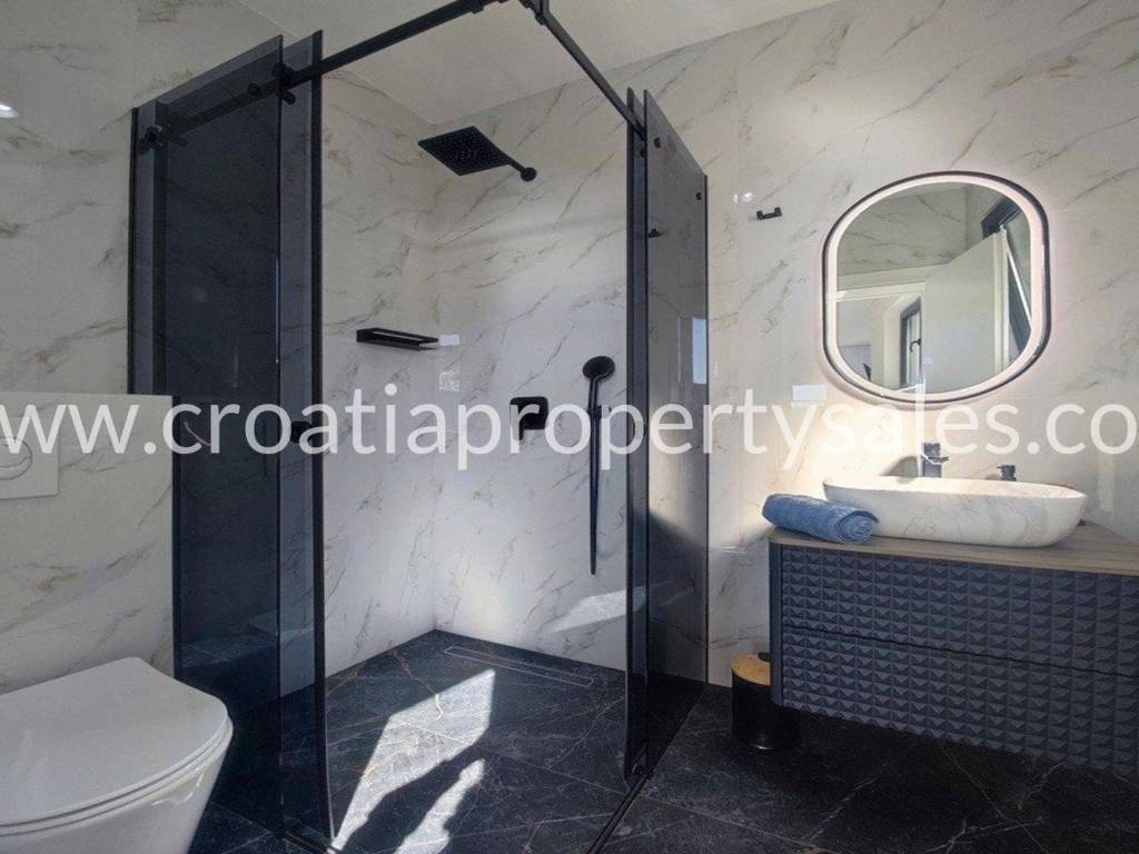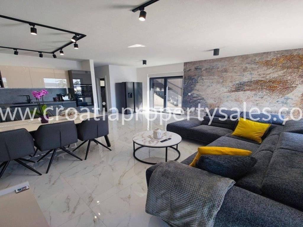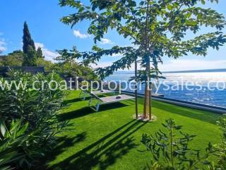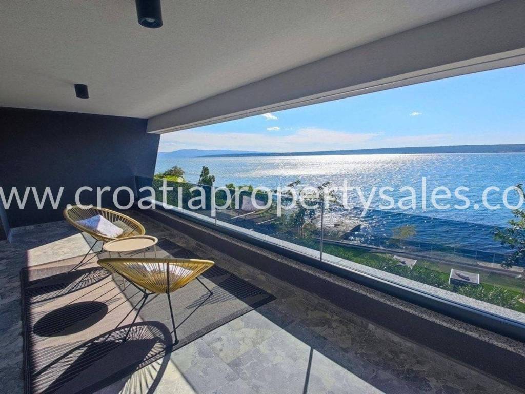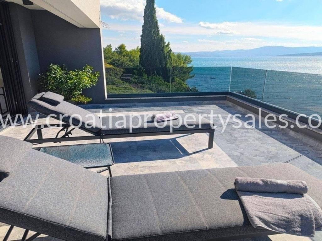 A unique modern villa in the first row in a quiet bay. There is no road between the villa and seafront and this location offers absolute peace and privacy and direct access to the beach.The outdoor area offers a swimming pool, a spacious sunbathing area, a lounge area and a grassy terrace with panoramic sea views.The villa spreads over three floors: The ground floor offers an open living room, kitchen and dining area with access to the terrace, wc and a multi-purpose room with a separate entrance that can be converted into a fitness, sauna or study room. The first floor has two large en-suite bedrooms and a shared terrace.The second floor offers a luxurious master bedroom with a private bathroom and large terrace with panoramic views over the sea.The villa is equipped with five air conditioners, underfloor heating in the bathrooms and solar panels. It is located close to all amenities and is excellently connected by the highway.The access to the villa is discreet and secured with private parking for several cars. Zadar airport is 28km away.