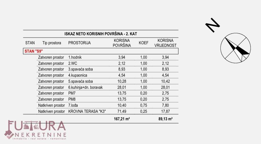 Posjeduje dva parkirna mjesta i krovnu terasu od 71,49 m2.
