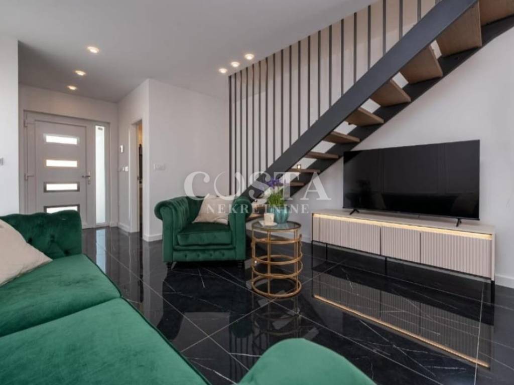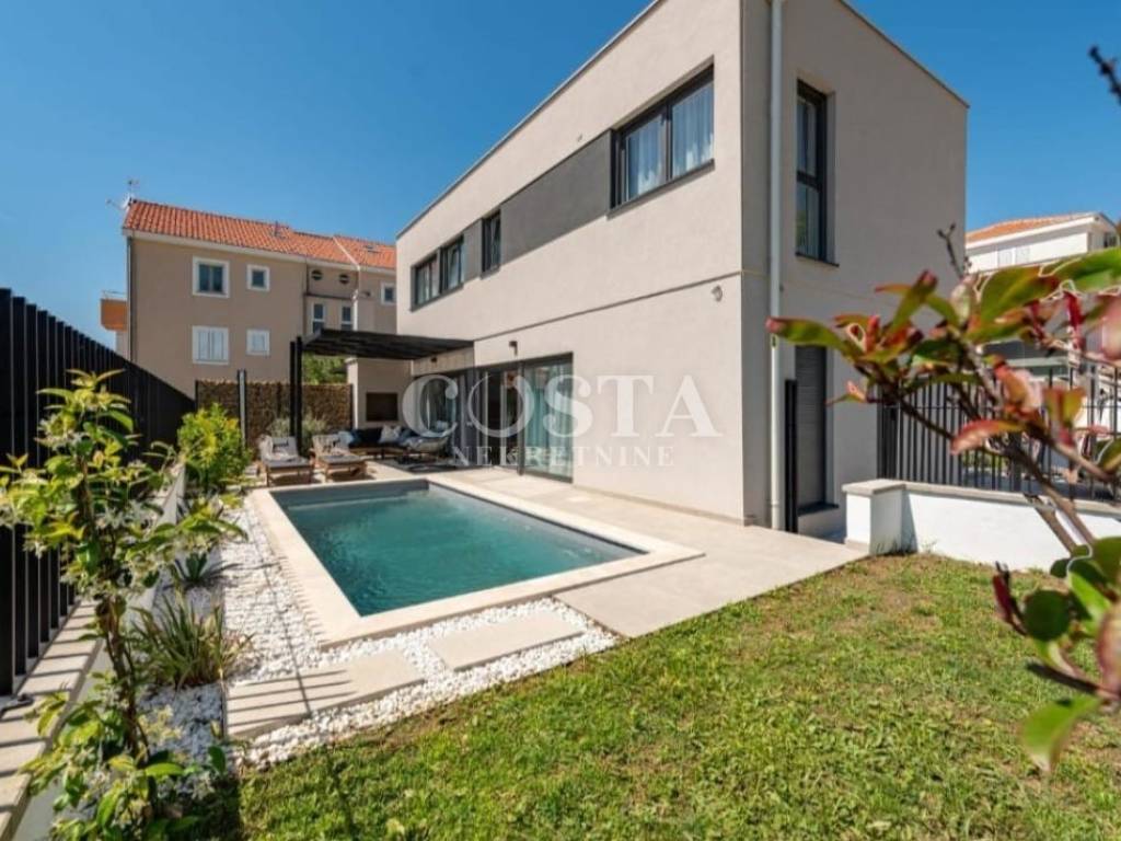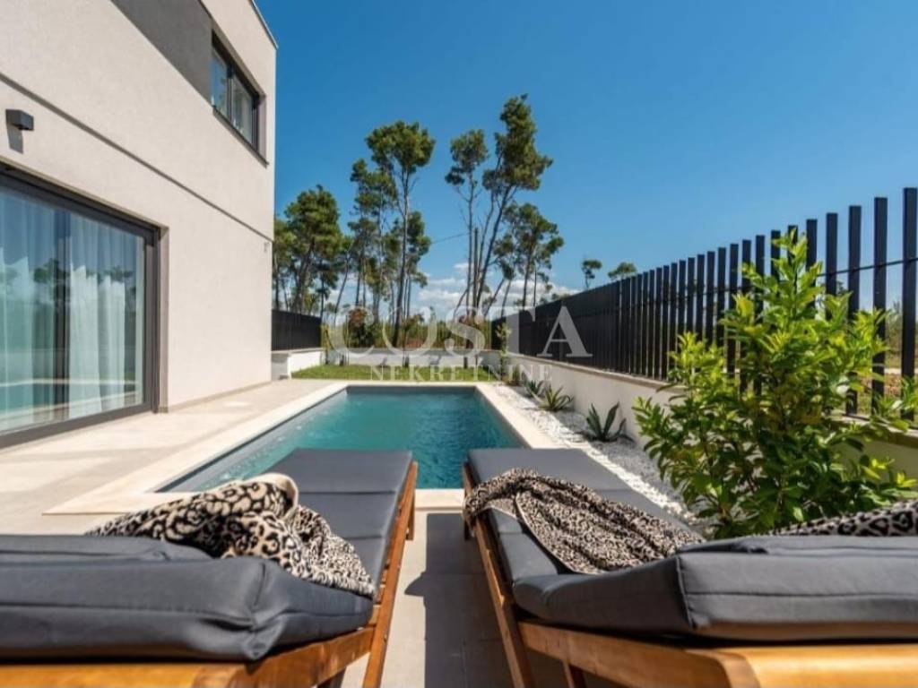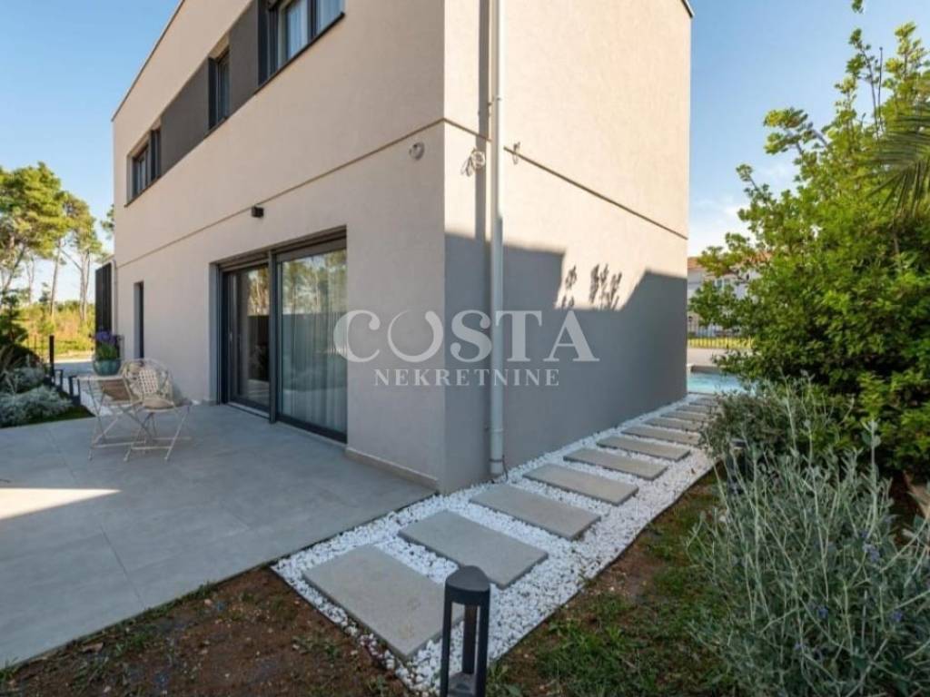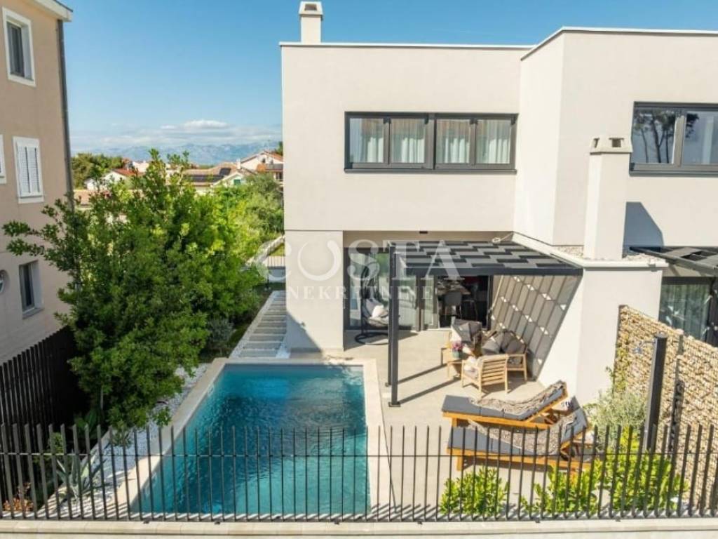 A part of a semi-detached house with swimming pool is for sale in an attractive location in Privlaka near Zadar. The residential unit of the semi-detached villa has an area of ​​90 m2 and a garden of 160 m2. It consists of a ground floor and an upper floor. The ground floor has a spacious living room, kitchen and dining room, additional toilet and entrance area with a staircase. The upper floor has three bedrooms and two bathrooms. The living room leads to a spacious terrace and garden with a swimming pool, barbecue, and a sunbathing area and a courtyard with private parking.