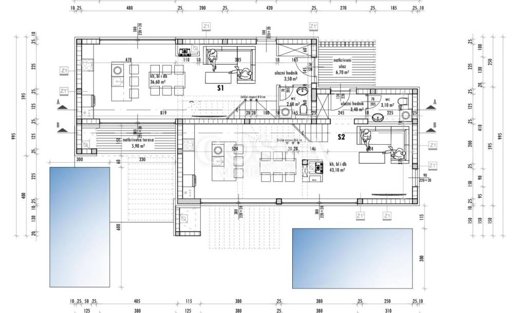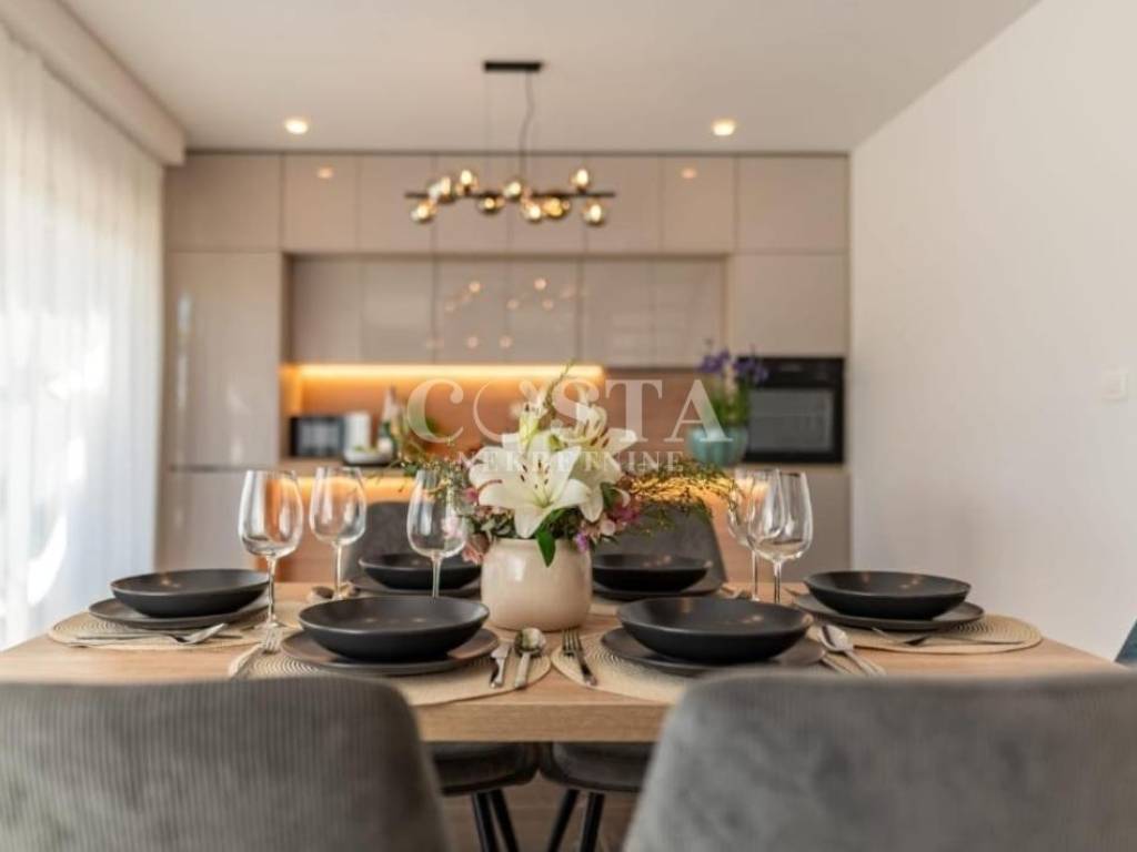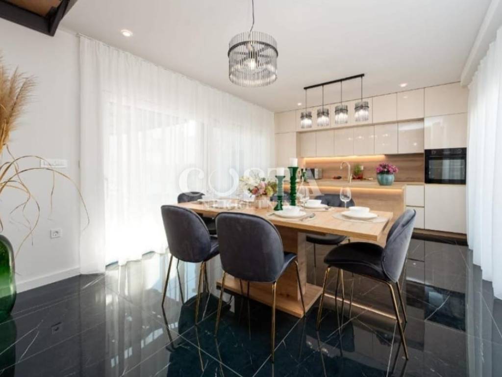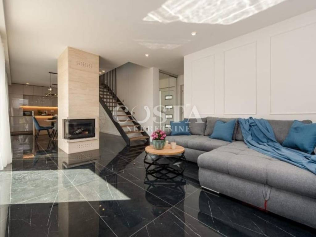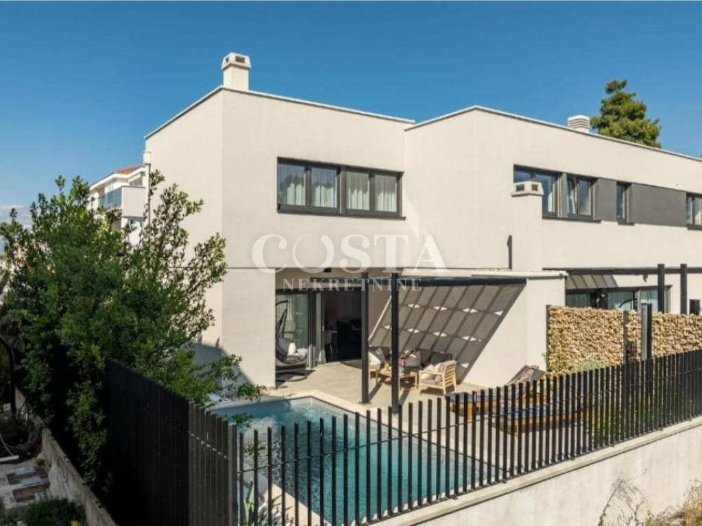 A part of a semi-detached house with swimming pool is for sale in an attractive location in Privlaka near Zadar. The residential unit of the semi-detached villa has an area of ​​90 m2 and a garden of 160 m2. It consists of a ground floor and an upper floor. The ground floor has a spacious living room, kitchen and dining room, additional toilet and entrance area with a staircase. The upper floor has three bedrooms and two bathrooms. The living room leads to a spacious terrace and garden with a swimming pool, barbecue, and a sunbathing area and a courtyard with private parking.
