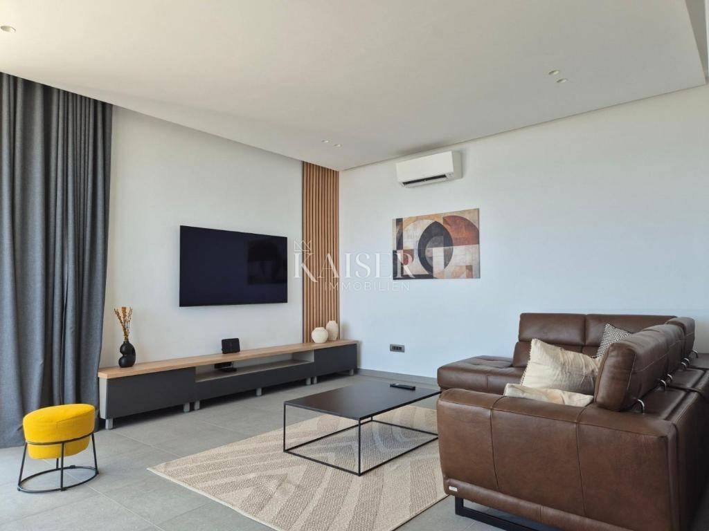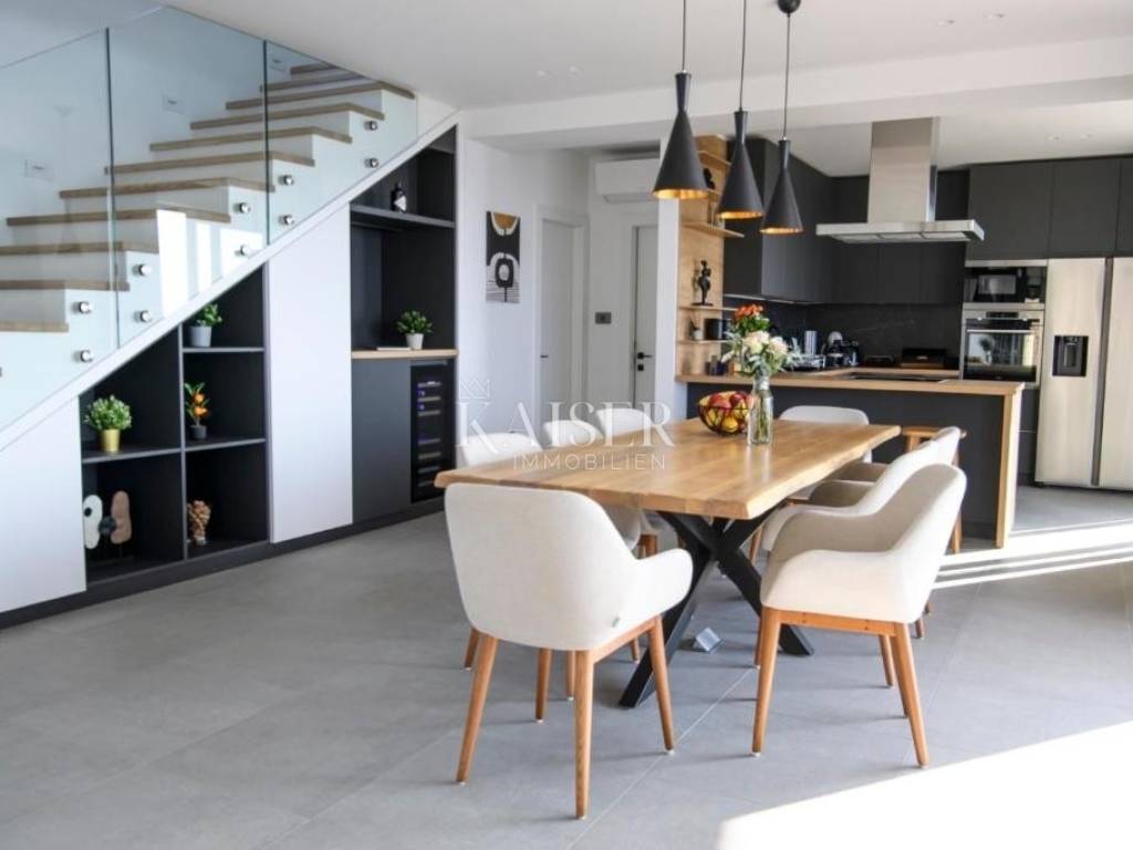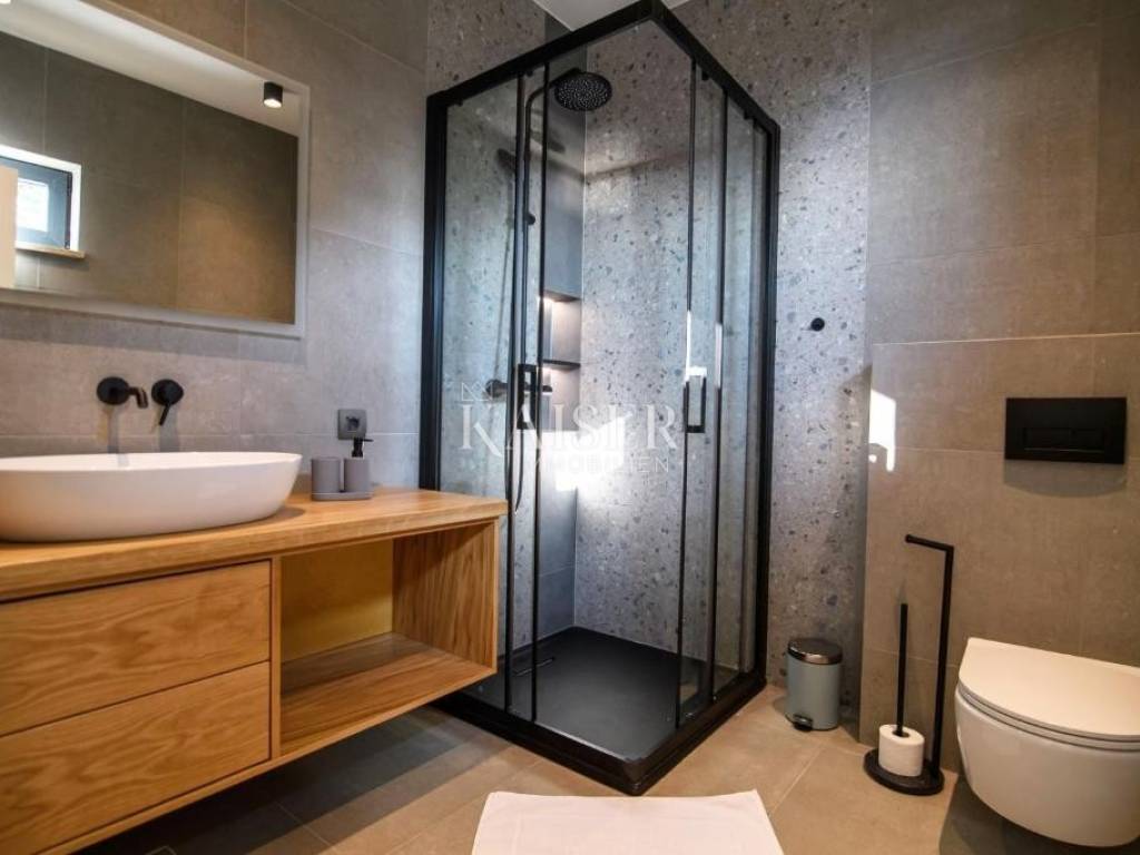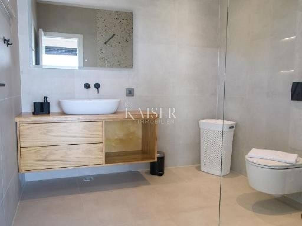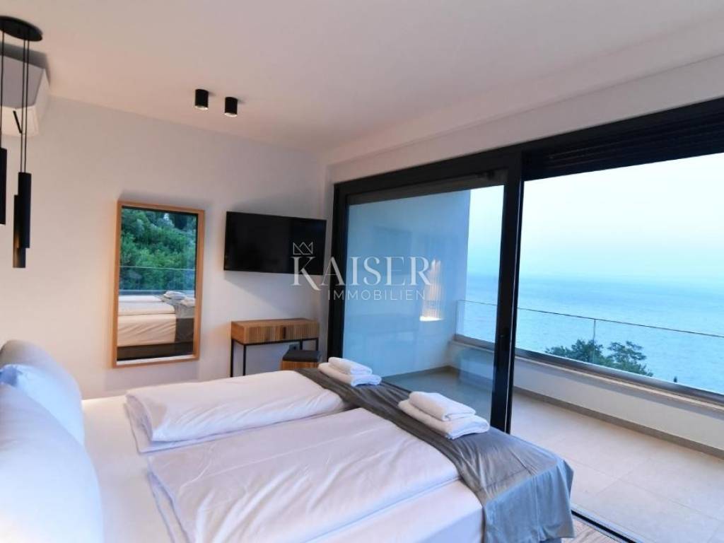 On the first floor of the villa there are three spacious bedrooms, each with its own bathroom. The floors of the rooms are laid with polished oak parquet. Each room has air conditioning, electric roller shutters, a TV, and a zone temperature indicator. Two rooms have covered terraces with spectacular views of the sea and the Kvarner islands, which makes every waking moment a special experience. The villa is equipped with the most modern materials and top-quality equipment. Special attention has also been paid to the lighting and lighting fixtures that create the desired atmosphere of light and shadow. The villa is fully furnished with quality furniture and is offered as is.