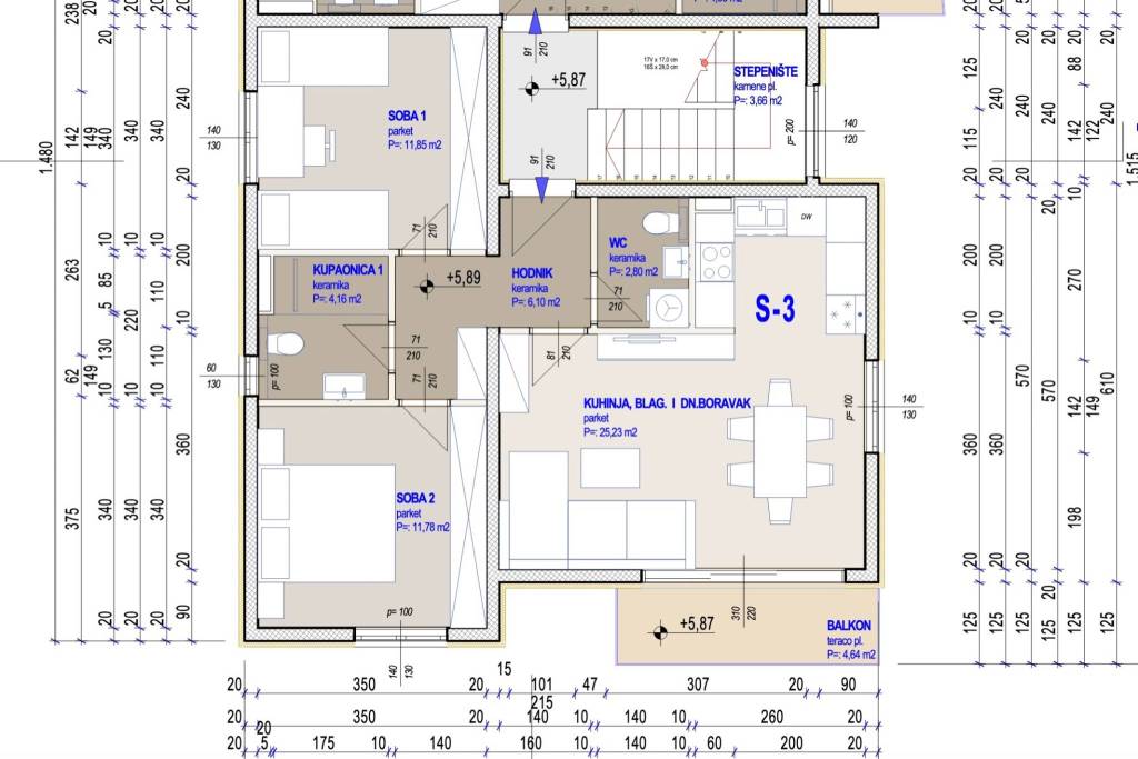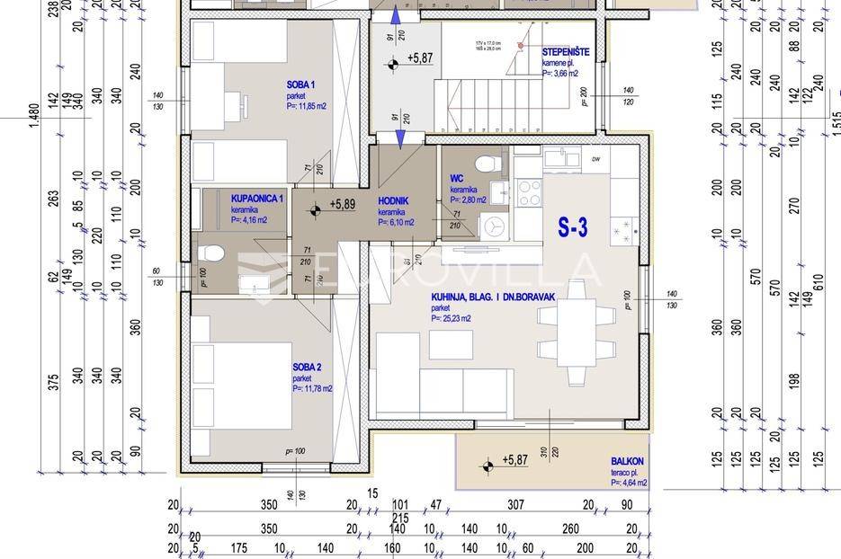 Kaštela Gomilica, dvosoban stan od 66,56 m2 u novogradnji na drugom katu manje stambene zgrade s četiri stana uz pripadajuće vanjsko parking mjesto.Stan se sastoji se od: dnevnoga boravka kuhinje i blagovaonice, kupaonice s WC-om, hodnika, dvije spavaće sobe, lođe naslonjene na stan (izlaz iz dnevnog i manje spavaće sobe). Zatvorena stambena površina stan je 62 m2 uz natkriveni balkon od 4,64 m2.Uz stan je obavezna kupnja i pripadajućeg natkrivenog parkirnog mjesto od 13,5 m2, po cijeni od 15.000 EUR.Orijentacija stana: jug-zapadPredviđeni završetak radova je 12/2026.g.Kvalitetna gradnja uz izvrsnu toplinsku izolaciju termo fasada, PVC zatvori podizno klizne stijenke s električnim roletama, podovi s keramičke pločice i parket, podno grijanje u kupaonici, kompletno opremljena kupaonice. Sve prostorije u stanu su postavljene instalacije klime.Za sve dodatne informacije stojim vam na raspolaganju.... Više na eurovilla.hr, ID: 310330