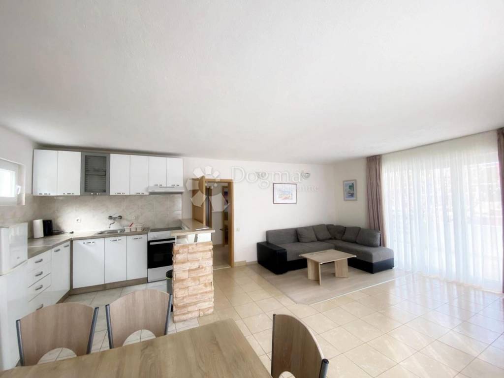 The ground floor features a cozy apartment with two bedrooms, a bathroom, and a spacious open-plan living room with kitchen and dining area, leading to a large sunny terrace perfect for relaxation and entertaining.